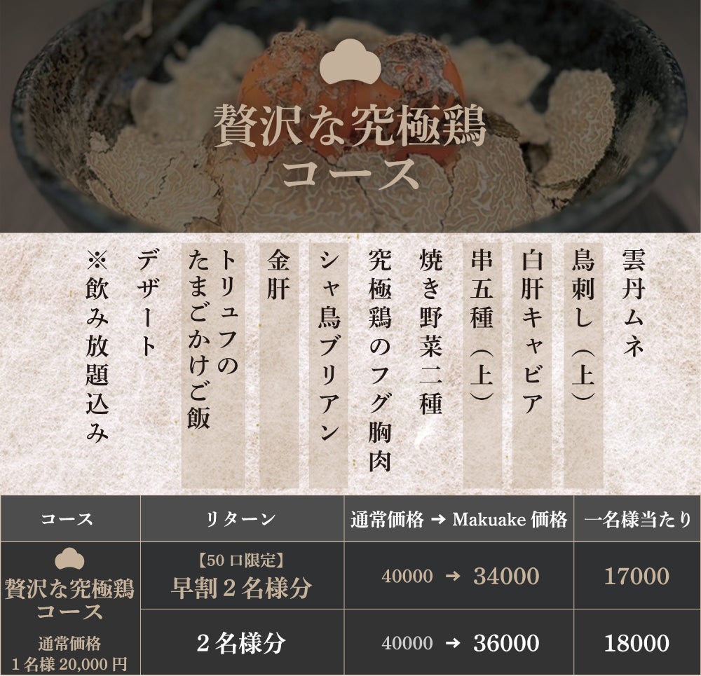 (上)は通常よりレア部位などを使用し贅沢な一品に仕上げ、ごはんものでは熊の焼鳥名物たまごかけご飯に卵との相性抜群のトリュフをふんだんにふりかけたトリュフのたまごかけご飯をお楽しみいただけます。