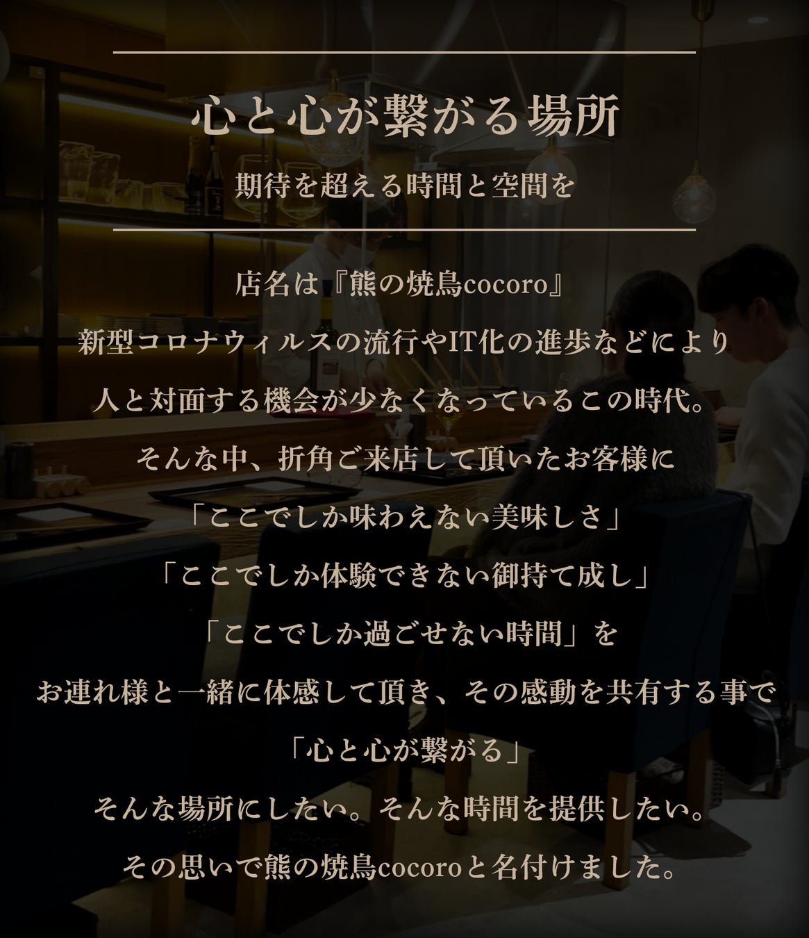 東京は新宿のド真ん中、私たち熊の焼鳥の体験価値の提供はご予約時から始まります。ご予約いただてからご来店頂く際の期待と入店時の体感をより楽しんで頂くためにも場所はあえて非公開とさせて頂きます。