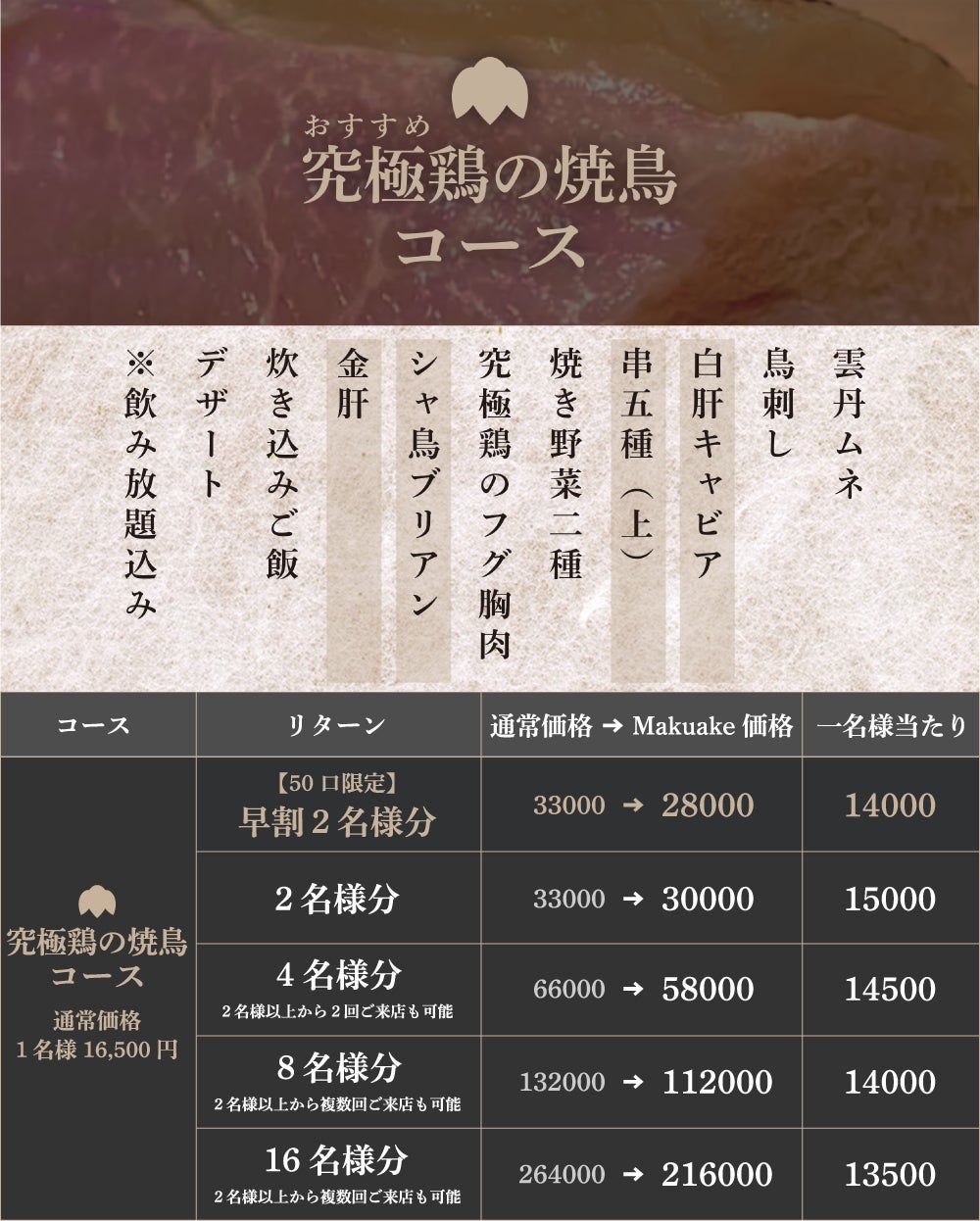 贅沢な究極鶏コースは、熊の焼鳥cocoroを最上級に楽しんで頂く贅沢なコースとなっております。