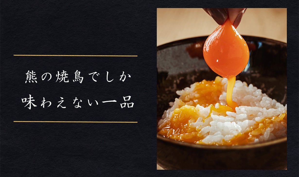 あの大物芸人のMさんに「今まで食べた、たまごかけご飯で一番おいしい」と大絶賛の声を頂いた熊の焼鳥名物の"熊たまごかけご飯"は、だし醤油・生醤油・卵かけご飯用の醤油など200種類以上を試した結果、どれも合わず、独自で開発した醤油を使用。