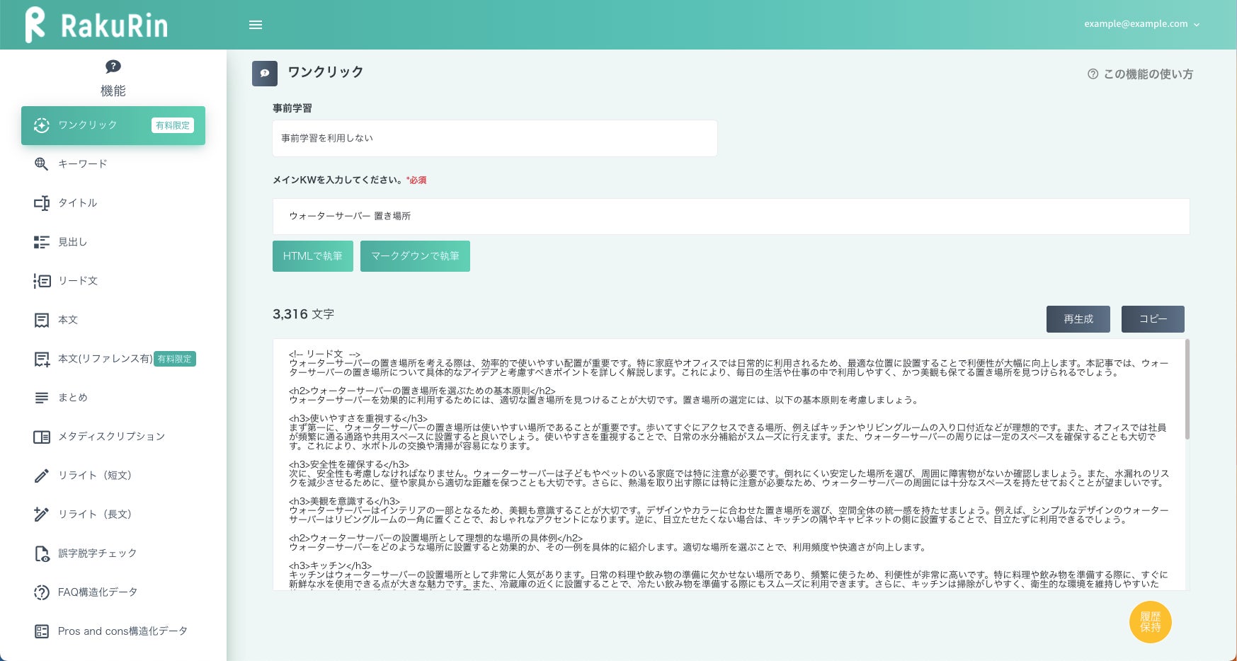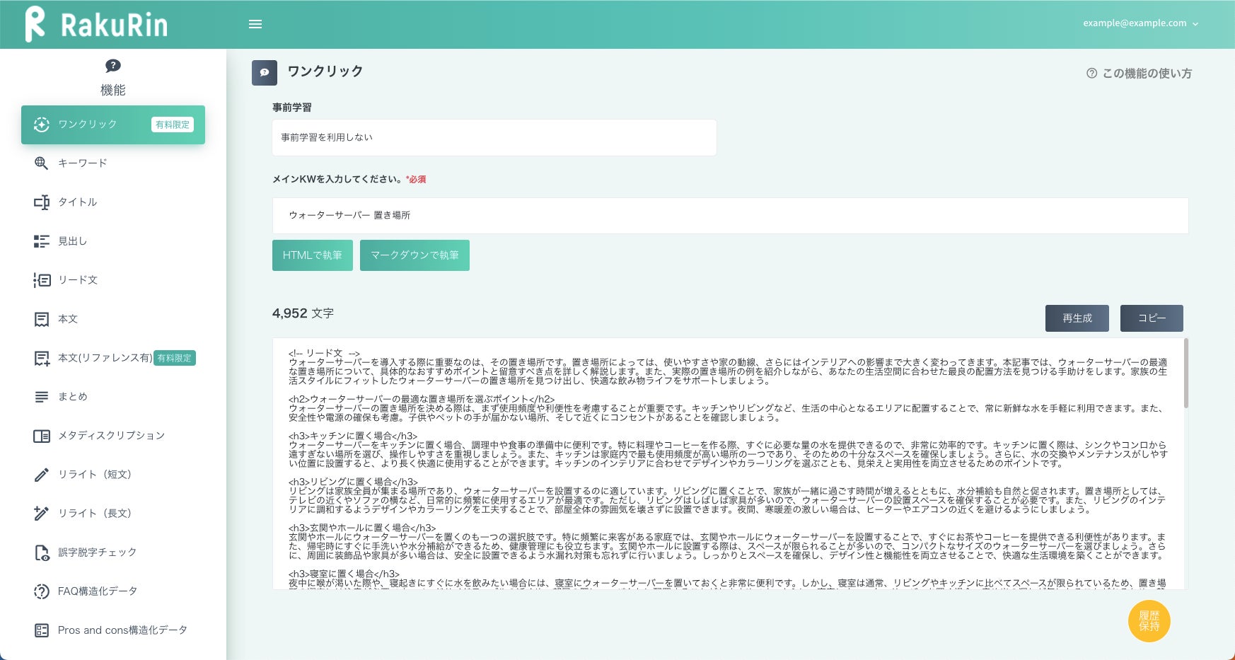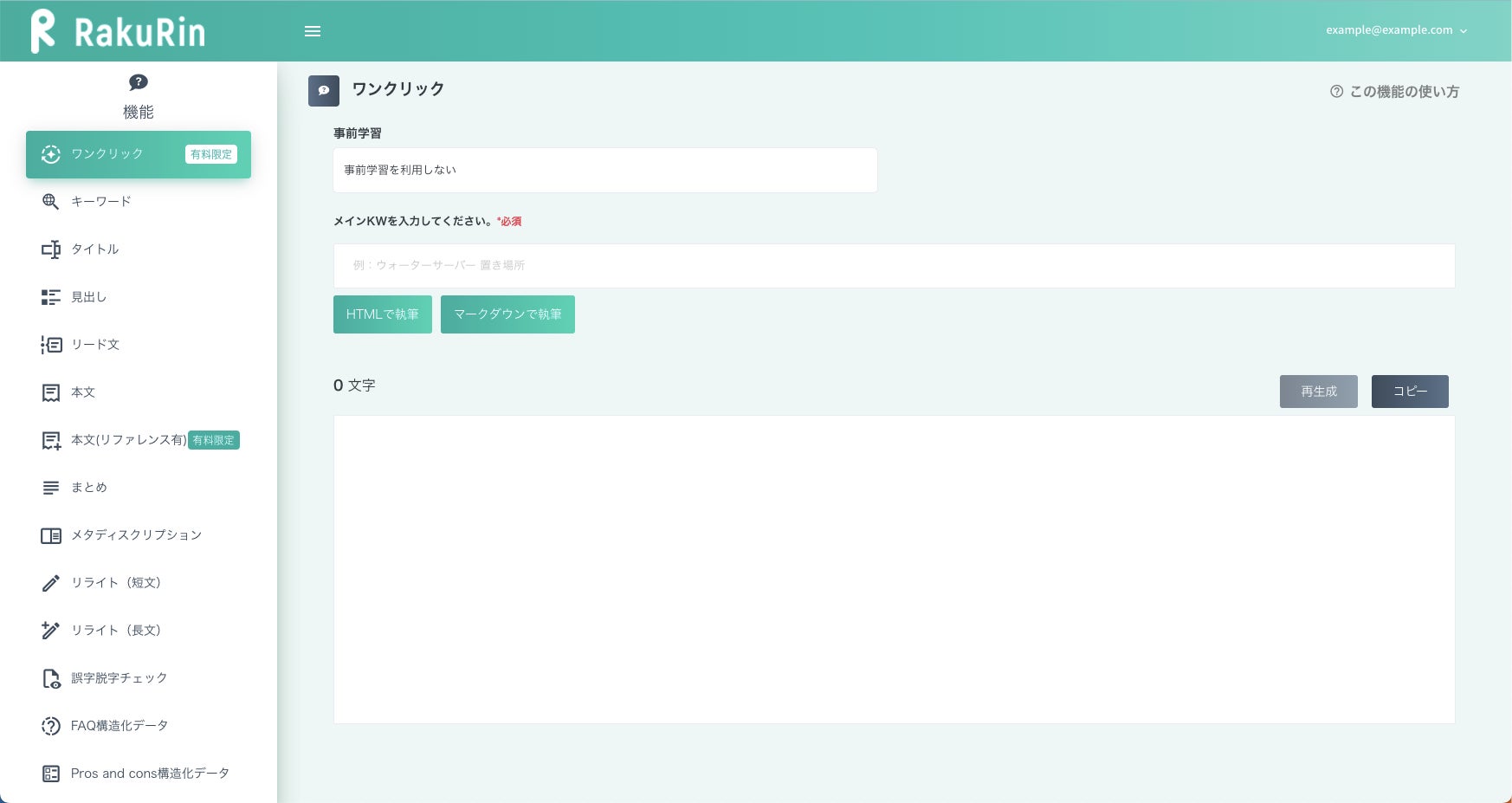 ワンクリック機能とは、キーワードを入れて執筆ボタンを押すだけで、キーワードに沿った導入文・見出し・本文がまとめて出力される機能です。