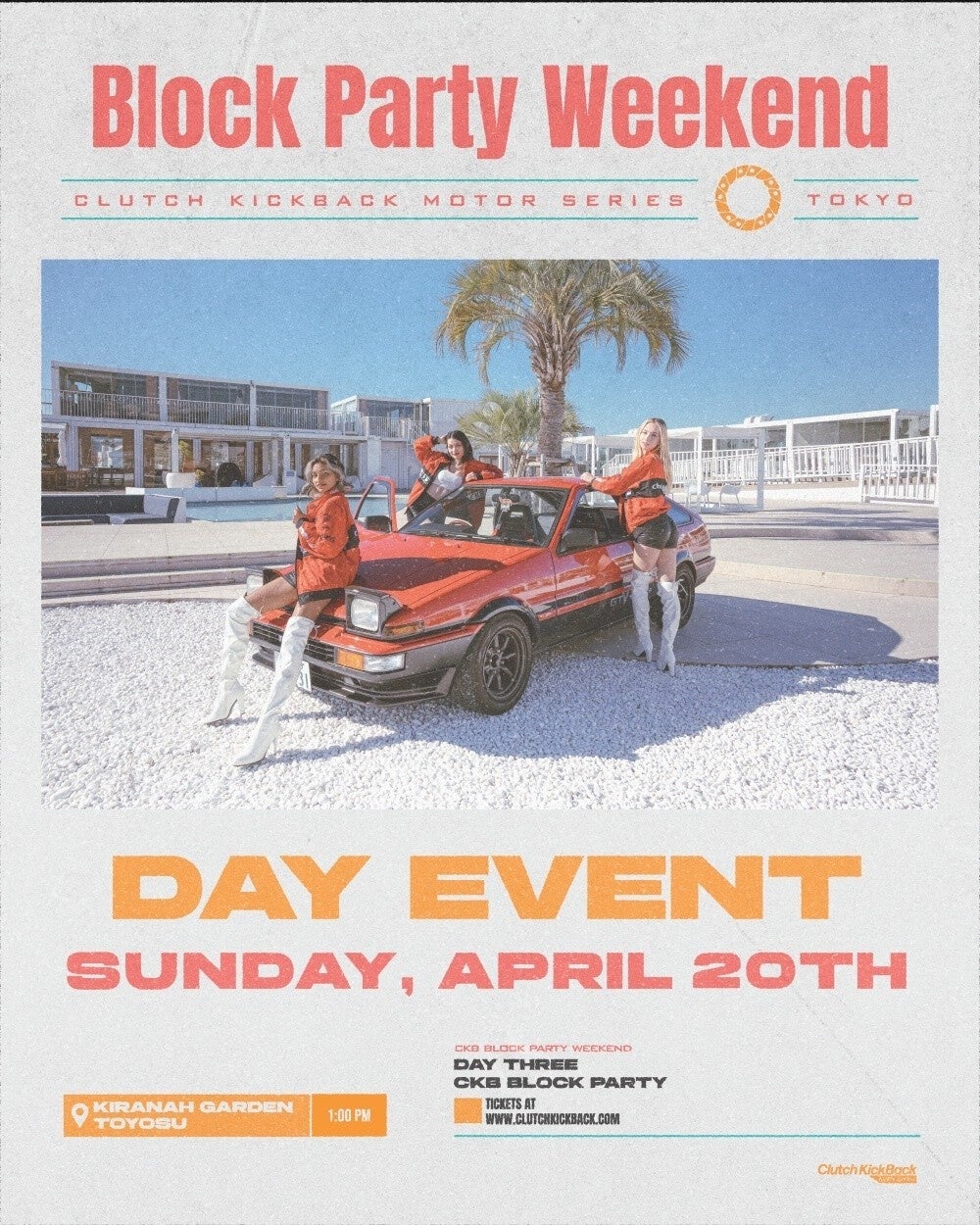 4月20日(日)にはいよいよ「CKB Block Party」が開催! 会場となる、東京湾を一望する美しい景観のベニュー、キラナガーデン豊洲にて、クルマ好きに向けた Clutch Kickback でしか味わえない唯一無二のパーティーが展開される。