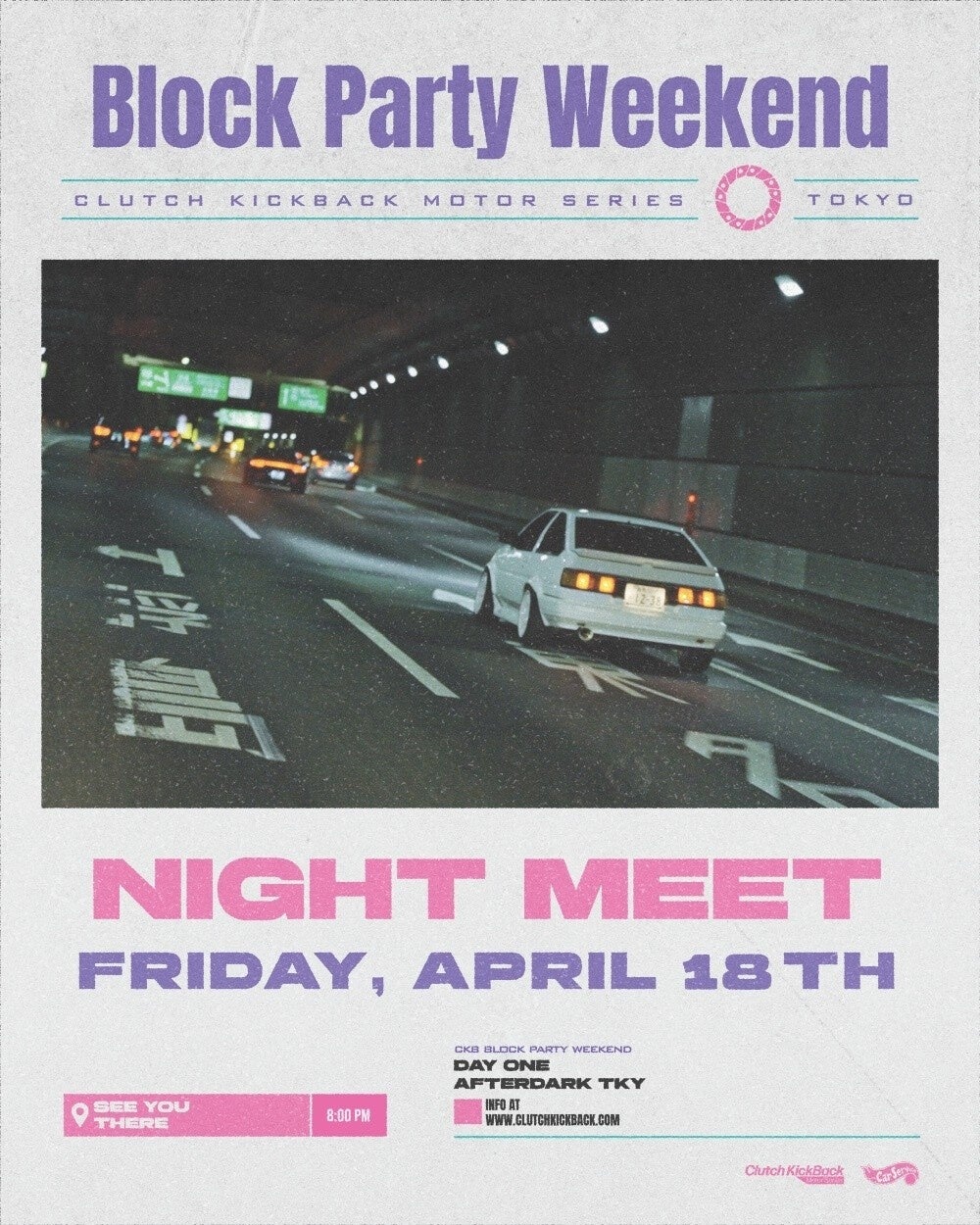 英語圏のアマチュアドリフターにより2022年よりスタートしたイベントシリーズ「The Clutch Kickback Motor Series」が、2025年4月18日(金)、20日(日)に JDV カルチャーと音楽が融合するイベント「Block Party Weekend - Clutch Kickback Motor Series Tokyo」を東京各所にて開催することを発表いたします。
