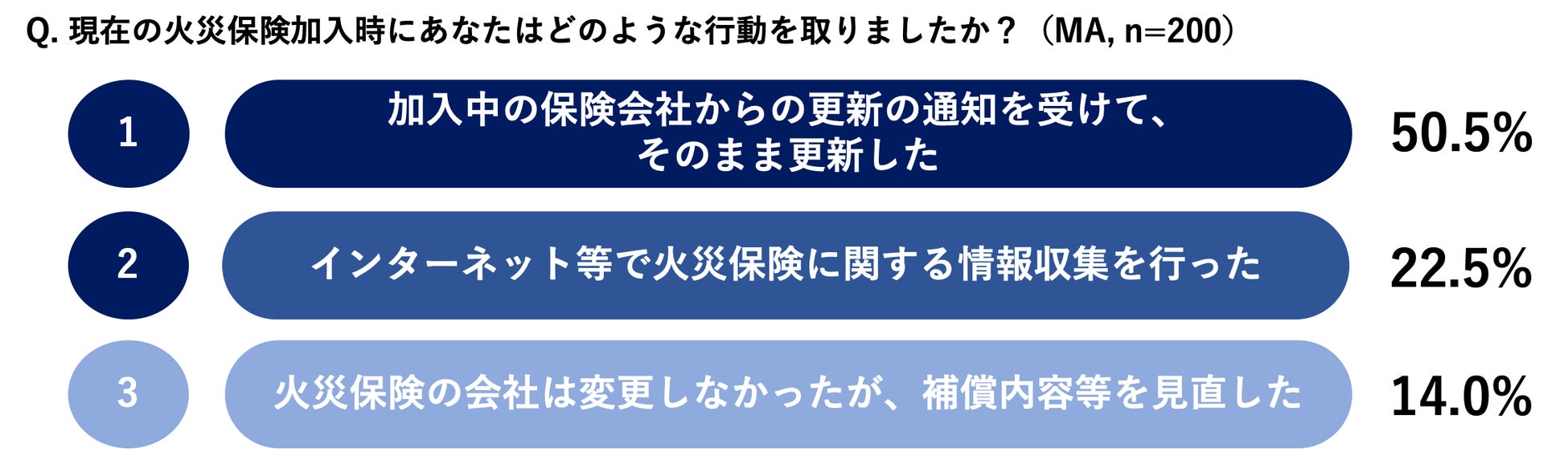 ・一方で、現在の火災保険加入時の行動として、約半数(50.5%)は更新通知を受けてそのまま更新しており、受動的に加入している傾向が見受けられる。