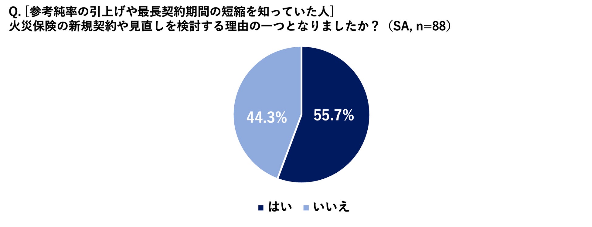 ・値上げを知っていた人の半数以上(55%)が、火災保険の新規加入や見直しをするきっかけの一つになったと回答。