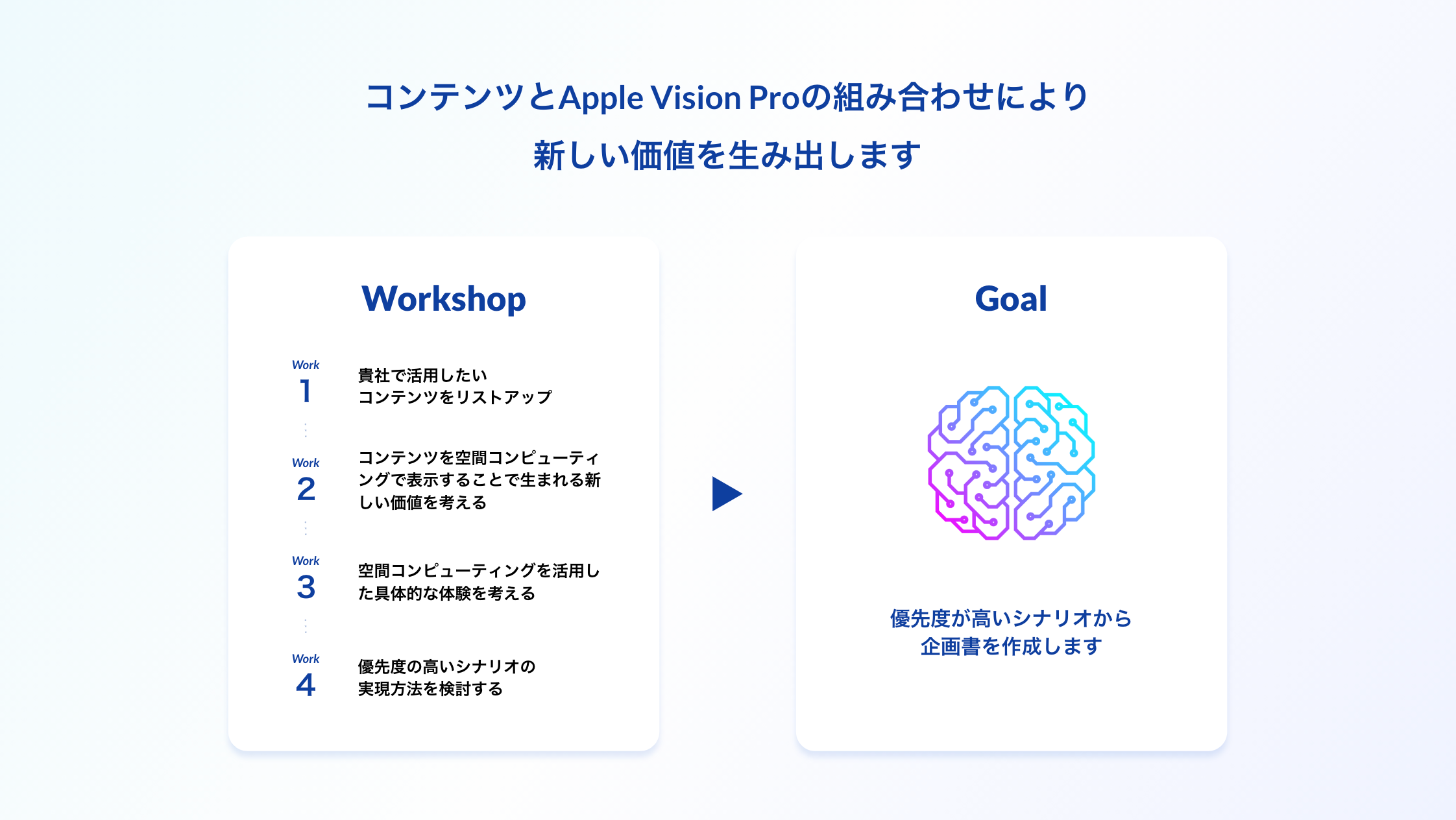 アツラエはこの度、Apple Vision Proの国内での販売開始に合わせ、Apple Vision Proの魅力・可能性は理解しているが進め方がわからないといった法人企業を対象に「空間コンピューティング・ワークショップ」を通して企業独自のコンテンツを活かしたアイデア創出や企画書作成、PoCアプリの開発までワンストップでサポートします。
