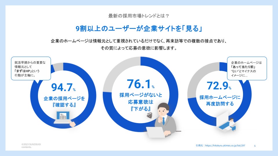 ヒトクルの調査によると、90%以上が「企業の採用ページを確認する」と回答しています。また、76.1%が「採用ページがないと応募意欲が下がる」ことが判明しています。