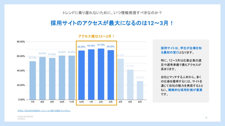 採用サイトは、学生が企業を知る最初の窓口となります。 特に、12〜3月は応募企業の選定や選考準備でアクセスが高まることがキャリタスの調査からわかります。
