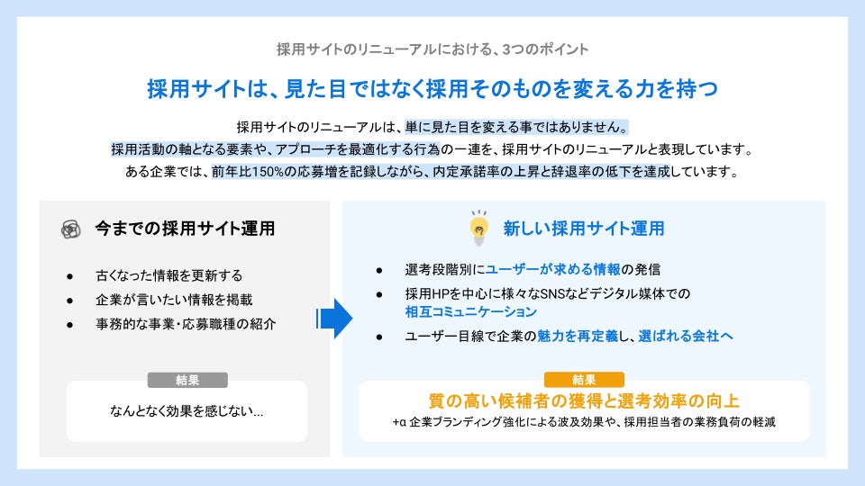 自社とマッチする人材から、多くの応募を獲得するには、サイトを通じて自社の魅力を発信するとともに、戦略的な採用計画が重要です。