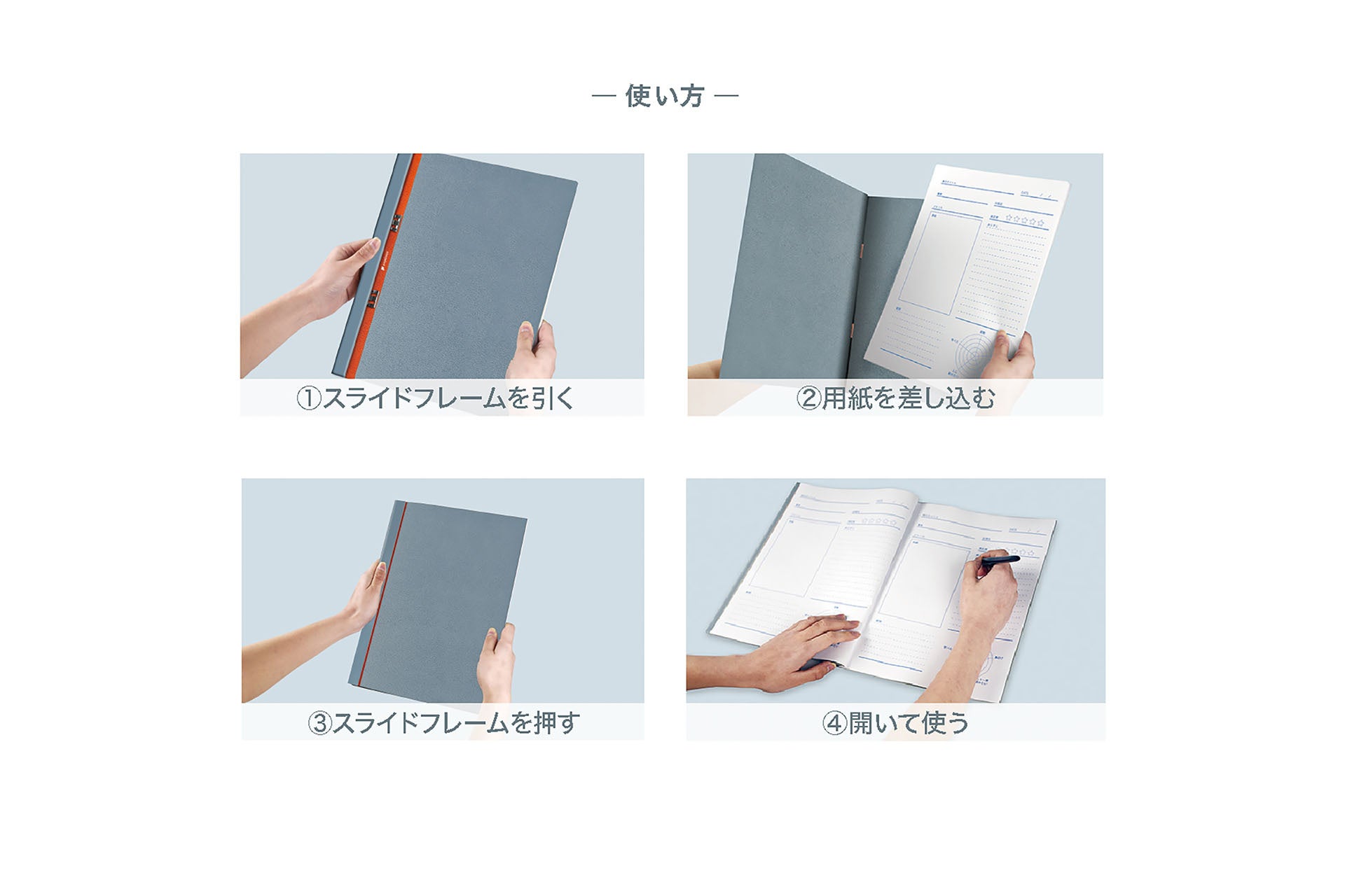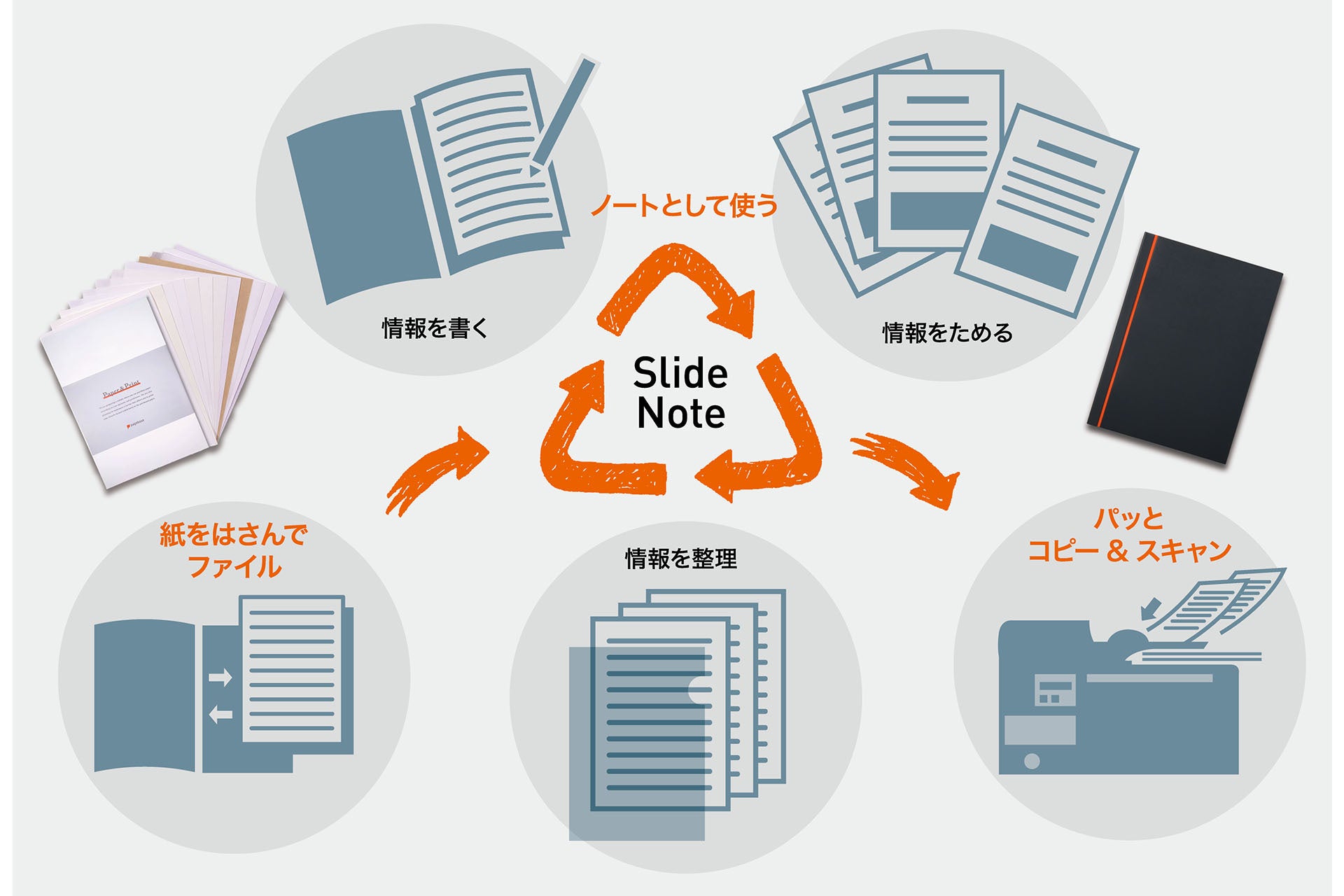 ファイリング機能とノート機能を兼ね備えたリングレスノート「SlideNote(スライドノート)」。