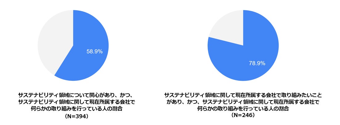 サステナビリティ領域について関心がある方(394人)の中で、サステナビリティ領域に関して現在所属する会社で何らかの取り組みを行っている人の割合は 58.9%、