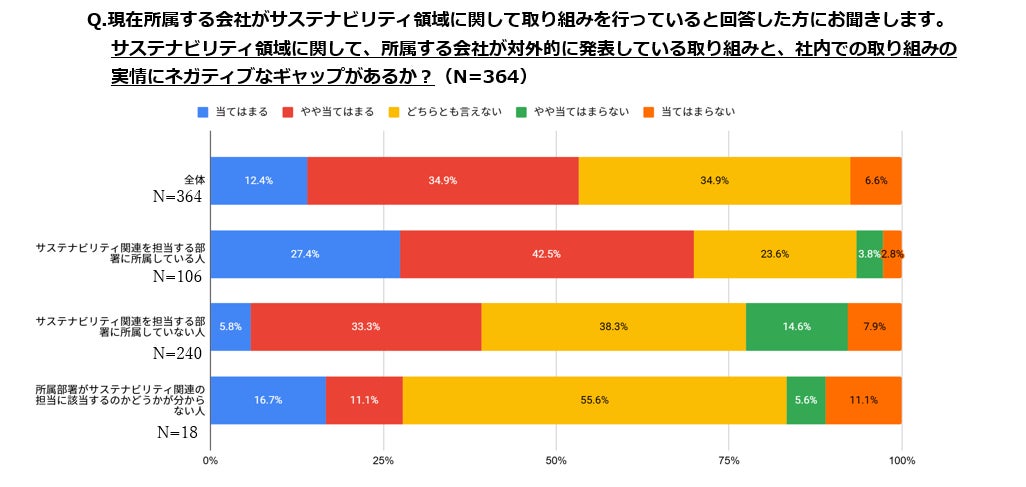 2つ目の質問項目(会社の対外的な発表内容と社内での取り組みの実績にネガティブなギャップを感じているか?)に「当てはまる」と回答をされた人の割合は、サステナビリティ関連部署の人の27.4% に対して、サステナビリティ関連部署外の人は 5.8%に留まります。