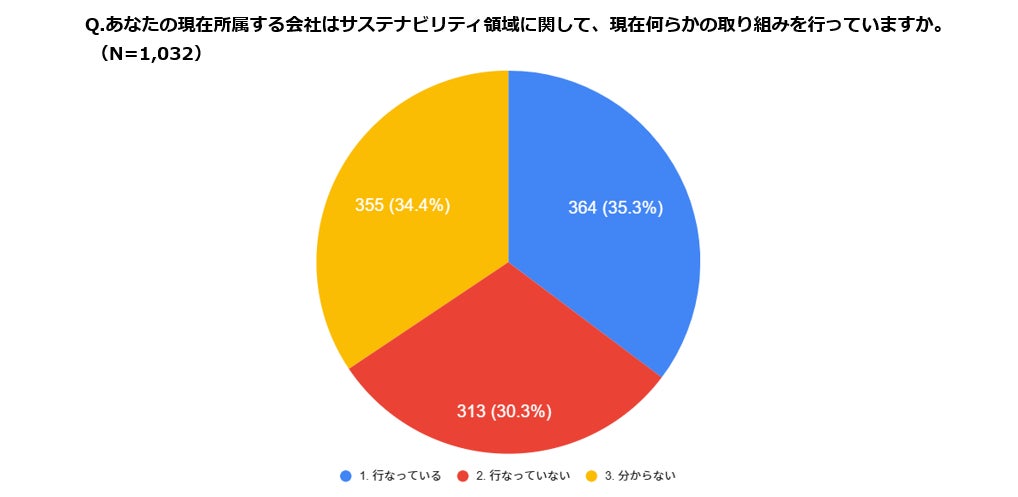 自身の所属する会社でサステナビリティ領域に関する何らかの取り組みを行っているかをお聞きしたところ、行っている(35.4%)、行っていない(30.3%)、分からない(34.4%)という結果になりました。
