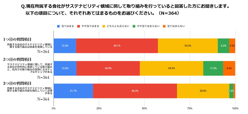 自身の所属する会社でサステナビリティ領域に関する何らかの取り組みを行っている方(364人)に、会社のサステナビリティ領域の取り組みに思うことをお聞きしたところ、