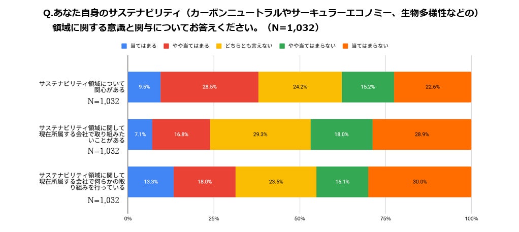 この(15.4%という)数値は、他の2つの質問項目の回答割合と比べても顕著に高く、サステナビリティ関連部署に身を置かずとも、サステナビリティの必要性を感じている人は多く存在することが読み取れます。