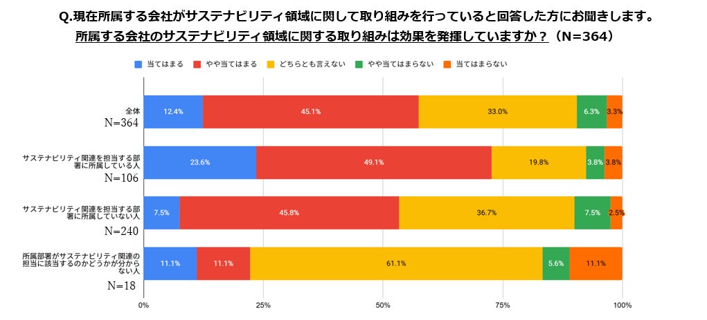 1つ目の質問項目(所属する会社のサステナビリティ領域に関する取り組みは効果を発揮していますか?)に「当てはまる」と回答をされた人の割合は、サステナビリティ関連部署の人の23.6%に対して、サステナビリティ関連部署外の人は 7.5%に留まります。