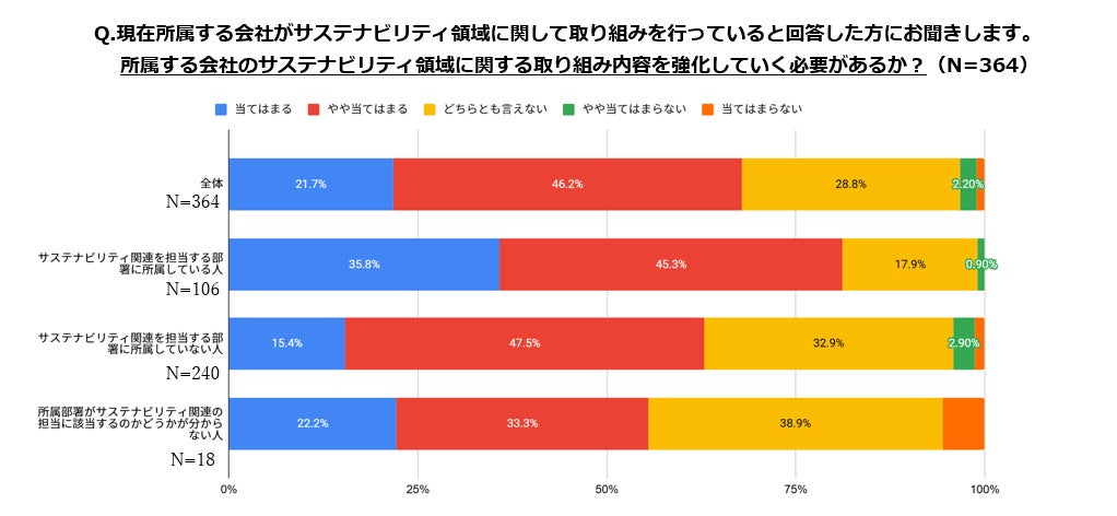 3つ目の質問項目(会社のサステナビリティ領域に関する取り組み内容を強化していく必要があるか?)に「当てはまる」と回答をされた人の割合は、サステナビリティ関連部署の人の35.8% に対して、サステナビリティ関連部署外の人は 15.4%という結果になりました。