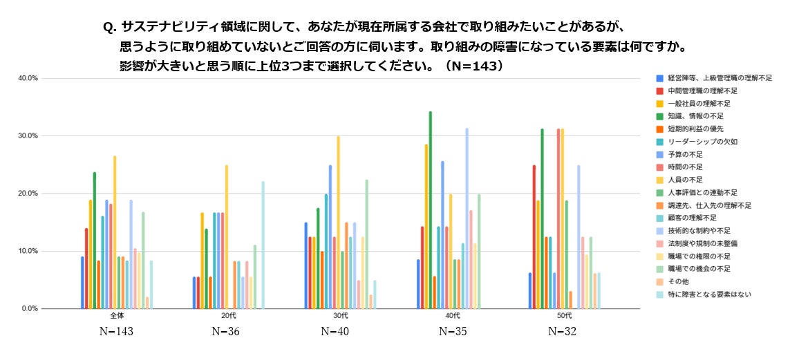 サステナビリティ領域に関して現在所属する会社で取り組みたいことがあるが思うように取り組めていないと回答された方々に対して、サステナビリティの取り組みの障害になっている要素をお聞きしたところ、年代によって異なる傾向が現れました。