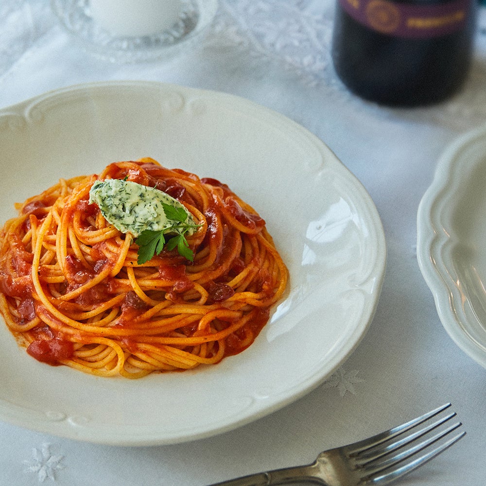主人公バベットの故郷フランスの料理にもよく使用される、オマール海老の風味豊かな、「大人むけのパスタ オマール海老のトマトソース」をベースにアレンジ。盛りつけたパスタにハーブバターを添えるだけで、フランス料理ならではのコクと甘み、華やかな香りをプラス。