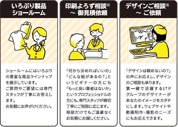 お客様がお気軽にご来店いただける「いろぷりショールーム」として、「いろぷり」サイト掲載商品のリアル展示と、ご来店での商品のご注文や会員登録なども「いろぷり」のスタッフがお手伝いします。また、多彩なITPグループのITPコンテンツへの窓口として、例えば、対面でのデザイン制作や撮影などのご相談・打合せも、ショールームにて専門スタッフがお客様へご案内をさせていただきます。