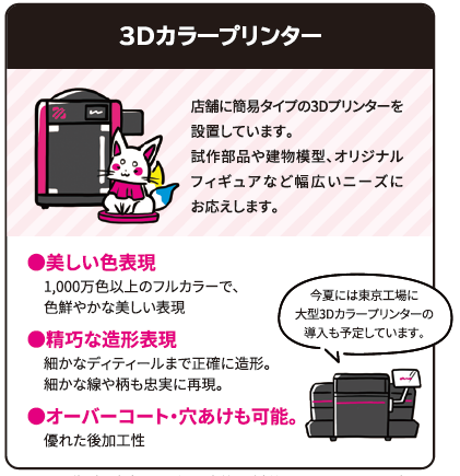 いろぷりの新商品として、夏頃には最新鋭の大型3Dカラープリンターを東京工場に導入。ITPグループで本格的に3Dデータ制作から、試作部品・建築模型や不動産関連の各種パーツからオリジナルフィギュアまで、お客様の幅広いニーズにお応えします。いろぷりでも新商品として取り扱いを予定しています。