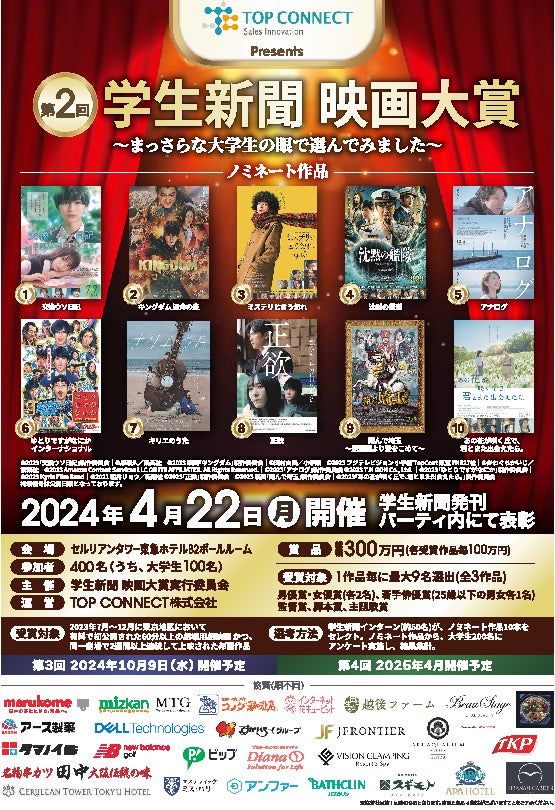 TOP CONNECT 株式会社(東京都中央区/代表取締役 内田雅章、以下 TOP CONNECT)は、若者の映画館利用率の低下をうけ、映画興行の復興を目的に「第2回 学生新聞映画大賞発表会」を2024年4月22日(火)、セルリアンタワー東急ホテルB2ボールルーム(「学生新聞・中高生新聞発刊パーティー第2部内」にて開催いたします。