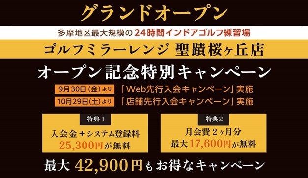 グランドオープンを記念して9月30日(金)より「Web先行入会キャンペーン」を実施します。オープン前日の10月28日(金)までにWeb申込みにてご入会いただいたお客様に入会金(22,000円)とシステム手数料(3,300円)が無料、11~12月の2ヵ月間は月会費が無料と最大総額42,900円がお得になります。さらに抽選でAmazonギフト券、最新距離計測器、人気ゴルフアイテムなど豪華景品をプレゼントします。