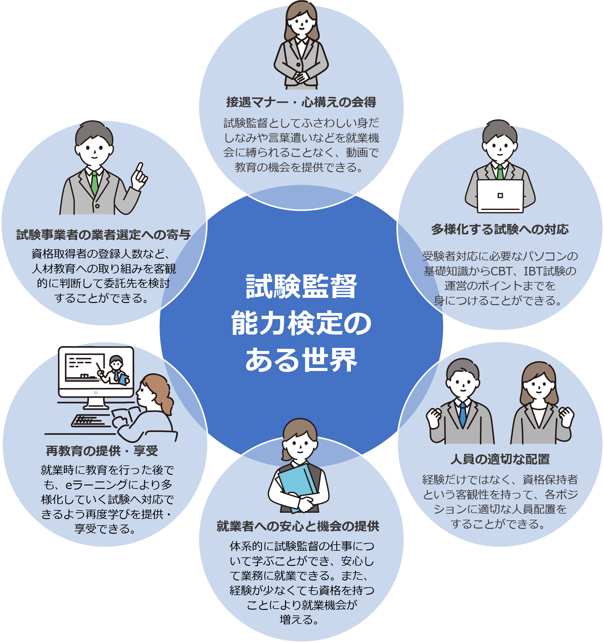 新型コロナウィルス感染症拡大を受け、試験の運営形態が急速に多様化している社会において、PBT試験、CBT試験、オンライン試験のいかなる環境であっても、試験監督としてふさわしい対応ができる人材の育成をすることで、受験生が120%の実力を発揮できる「安心・安全・快適な試験環境」を創っていきます。
