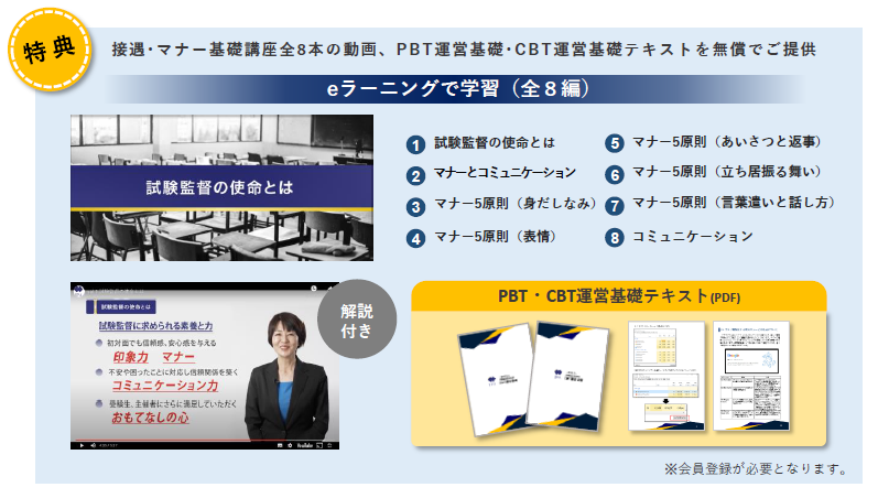 また、当協会は接遇・マナーについての研修動画、及びPBT、CBT試験の運営についての電子テキストを用意し、無料で提供いたします。eラーニングサイトで閲覧可能となっており、時間や場所を選ばずオンラインで誰でも学ぶことが可能です。