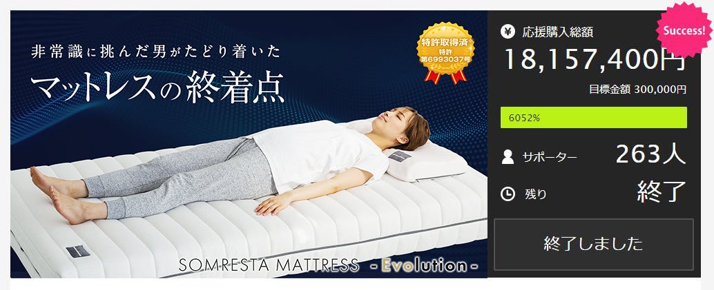同マットレスは『アタラシイものや体験の応援購入サービス』Makuake(マクアケ)にて先行予約販売を行ない、プロジェクト目標金額6052%の1815万円を達成しました。