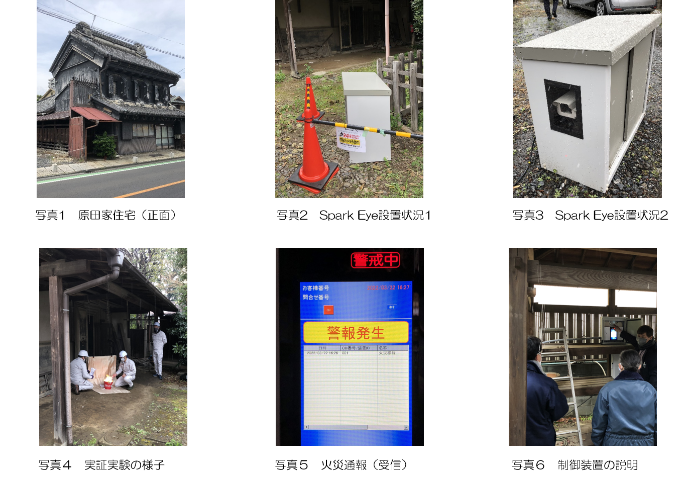 - 実証実験では、川越市教育委員会文化財保護課の立ち会いのもと、原田家住宅東蔵(写真1,2,3)の監視エリアにおいて10㎝以上の火を作った(写真4)結果、それをSpark Eyeが検知し、設定レベルに到達後はセントラル警備保障の制御装置(写真5,6)を介して指令センターに無事通報されました。