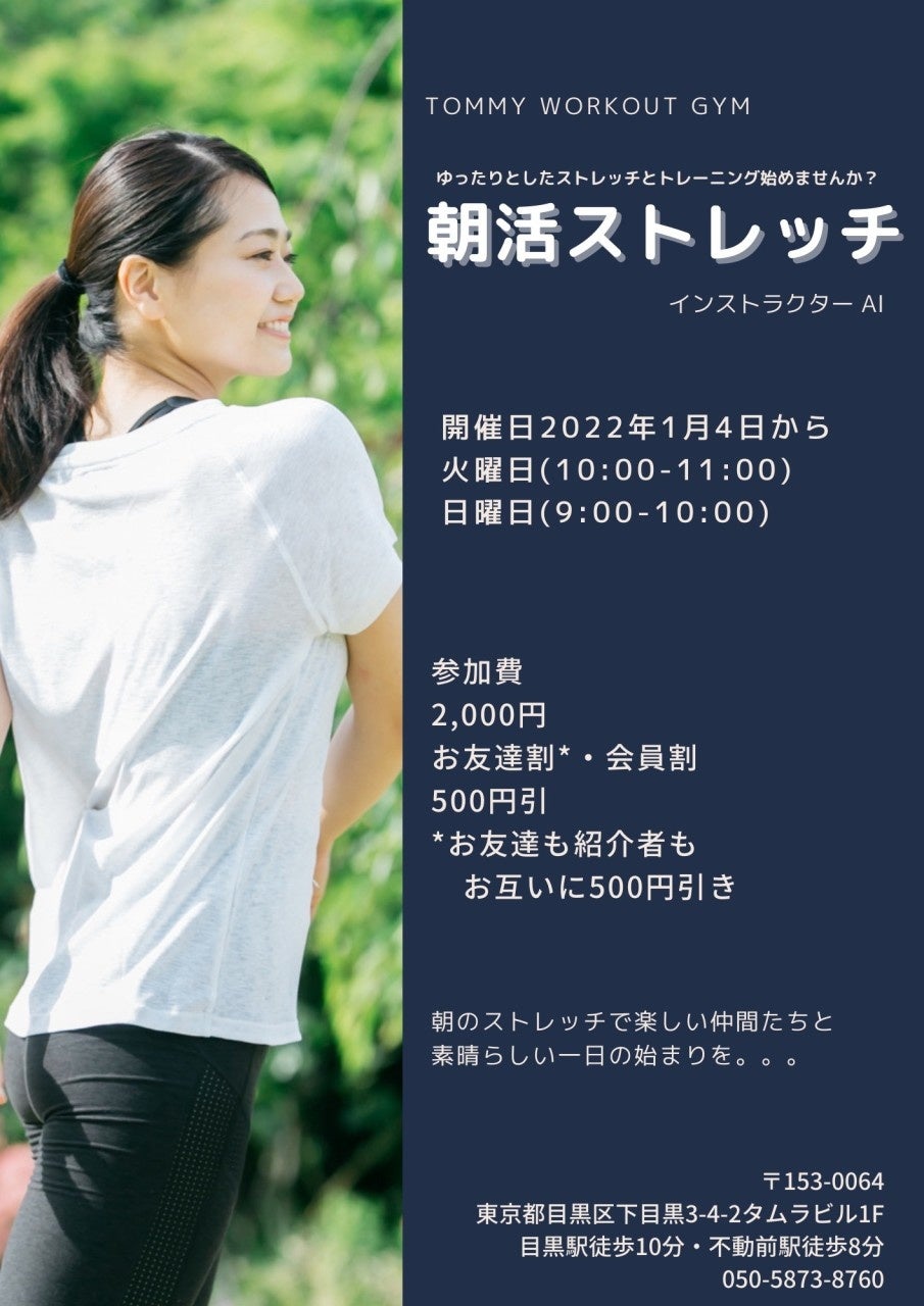 目黒駅・不動前,徒歩7分。朝からゆったりとストレッチ。月1回から通える継続できる運動習慣。2022年1月4日スタート!