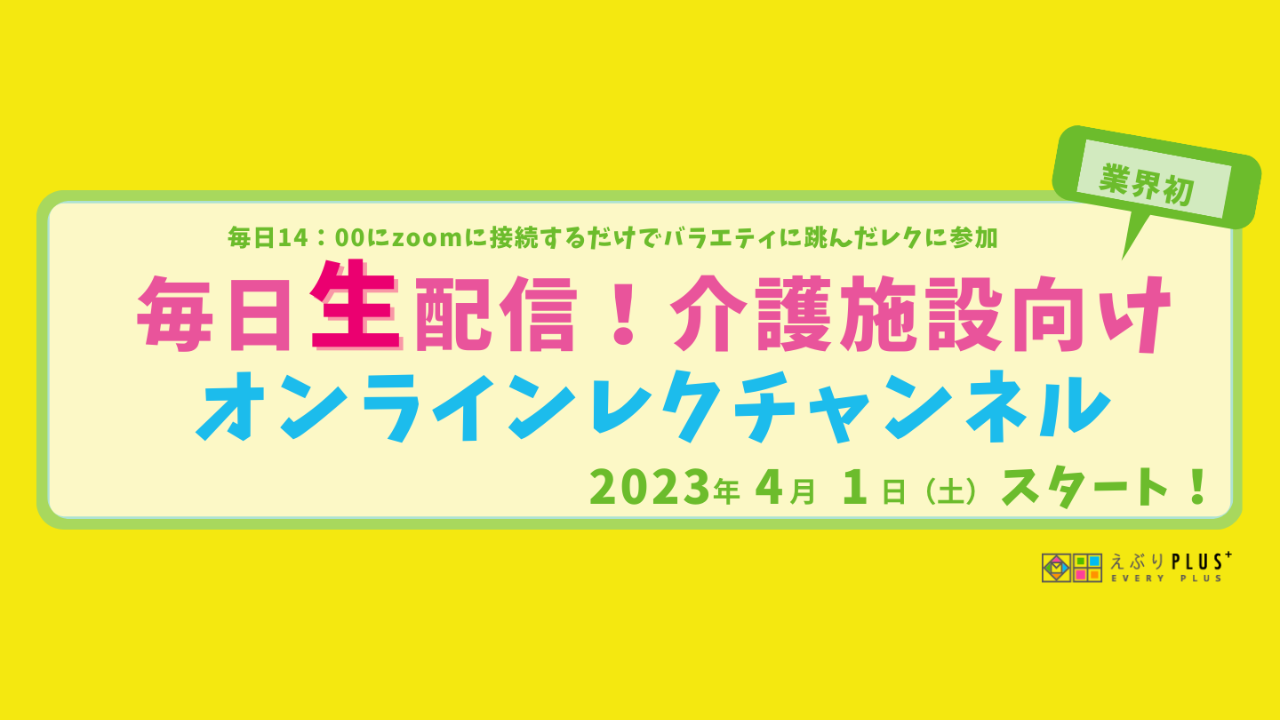 株式会社エブリ・プラス(本社:愛知県名古屋市、代表取締役:佐藤亜以)は、zoomに繋げるだけで、日替わりの人気レクリエーションに参加できる「毎日生配信!介護施設向けのオンラインレクチャンネル」の提供を2023年4月1日から開始します。