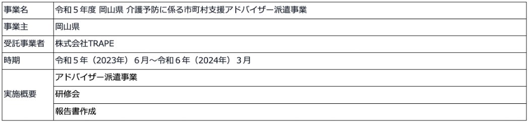 そして、この度岡山県令和5年度介護予防に係る市町村支援アドバイザー派遣事業に採択され、岡山県内の市町村と一緒に、高齢者が自分らしく暮らし続けることができる「地域づくり」を推進する伴走支援事業を実施することとなりました。