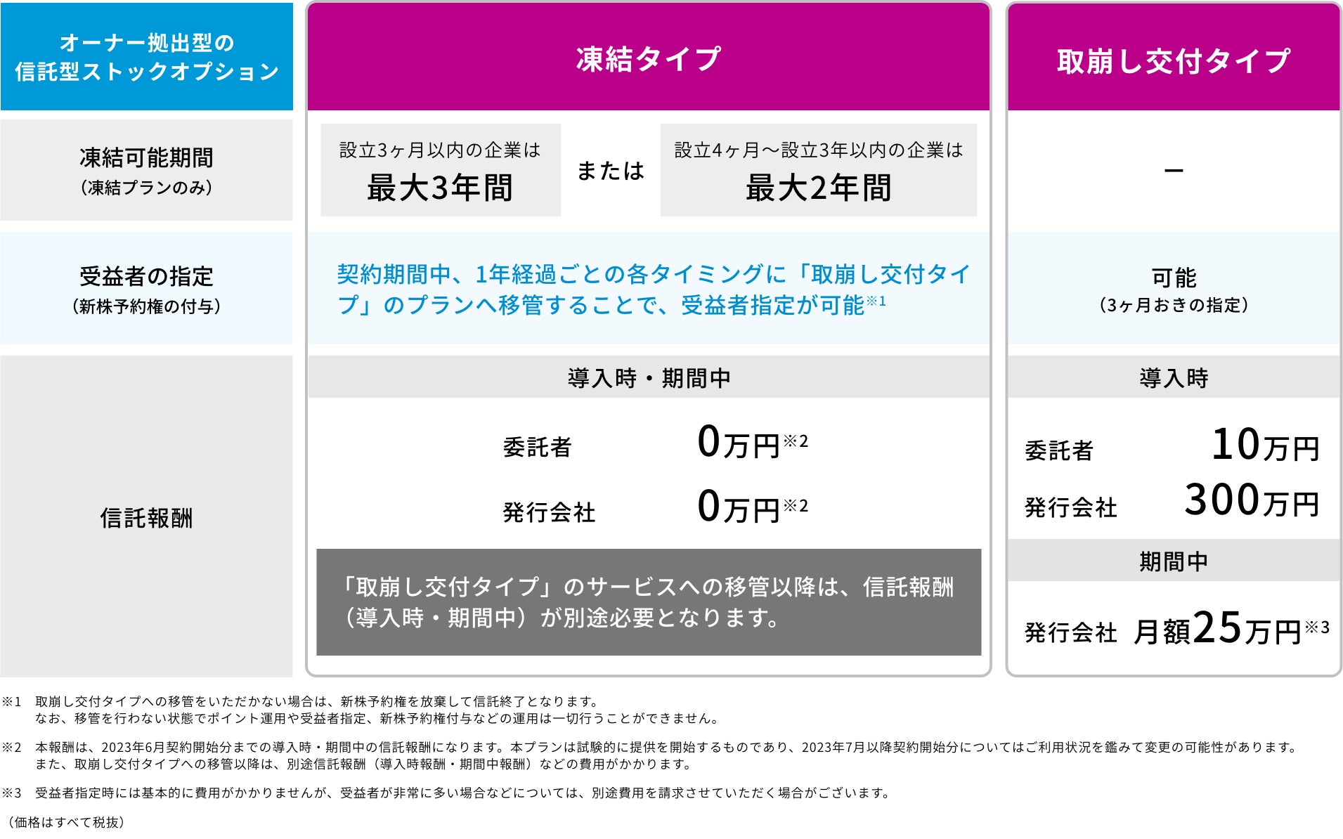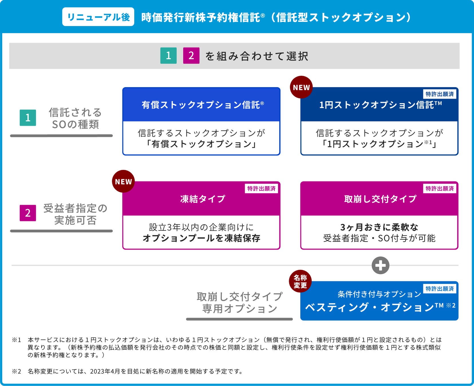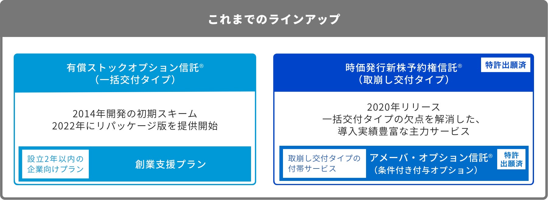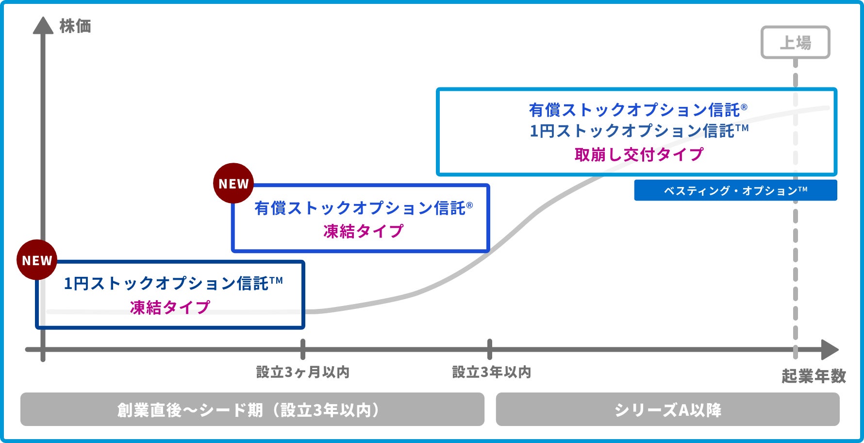 設立後3年以内のスタートアップ向けに、数年間、信託報酬ゼロで信託型ストックオプションを凍結保存できる「凍結タイプ」を提供開始。併せて、ラインアップをリニューアル。