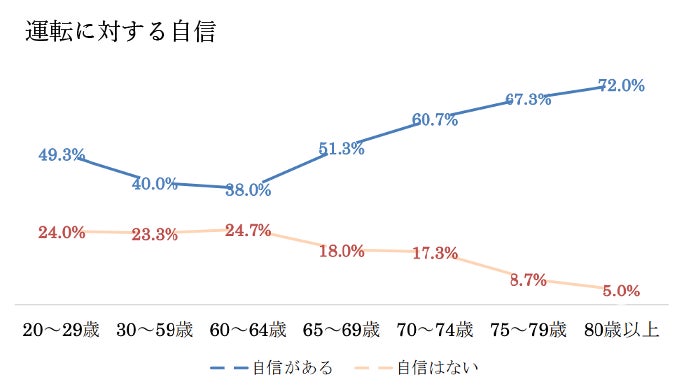 図1の通り、高齢者は視覚認知能力が下がっていることに加え、MS&AD基礎研究所の調査(図2)によると高齢ドライバーほど運転に対して自信がある割合が高いこともわかっています。このような人は、自身の能力が下がっていることに気づかず、危険運転のリスクが高い状態になっている可能性があると言えるでしょう。では、高齢者は免許を返納すればいいのでしょうか。生活に車が必要な地域もありますし、国立長寿医療研究センター 予防老年学研究部の調査によると「運転を中止した高齢者は、運転を継続していた高齢者と比較して、要介護状態になる危険性が約8倍に上昇する」という結果もでています。これは、生活範囲が狭まってしまうことによる影響や運転自体が高度な認知機能を必要とする活動だからではないか、と考えられています。そのため、do.Sukasuでは高齢者の視覚認知能力を適切にアセスメントし、トレーニングすることで「安全に運転をなるべく続けてもらうこと」が高齢者の健康寿命を延伸し、社会課題解決に繋がると考えています。