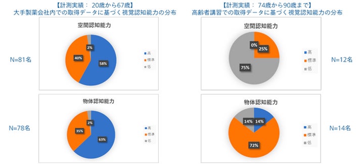 do.Sukasuは、超高齢社会において大きな社会課題となっている、視覚認知能力に関する社会課題を解決するため視覚認知の評価及びトレーニングを開発しています。視覚認知能力は、物の位置、距離感、遠近感を視認する空間認知能力と、線、図形、文字を視認する物体認知能力の2つに大きく分けられますが、どちらも加齢によって能力が落ちることが証明されています。図1のとおり、20歳から67歳まででは、視覚認知能力が「低」の人は2%程度なのに対し、74歳から90歳まででは、その割合が増加しており、75%の高齢者が空間認知能力にリスクありと言えます。