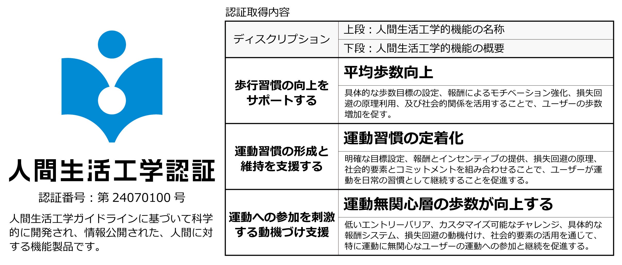 サービス分野で初めて人間生活工学認証を取得したということは、当社がこれまで国立研究開発法人産業技術総合研究所と共同で保有する歩行に関する特許技術や自社独自の行動変容特許技術IDOM*1を活かし「運動サプリ®」と「運動サプリ®GH」を健康経営®における従業員の運動機会の向上支援サービスとして開発・運用してきた実績が第三者機関である人間生活工学研究センターに正しく評価されたものと考えております。