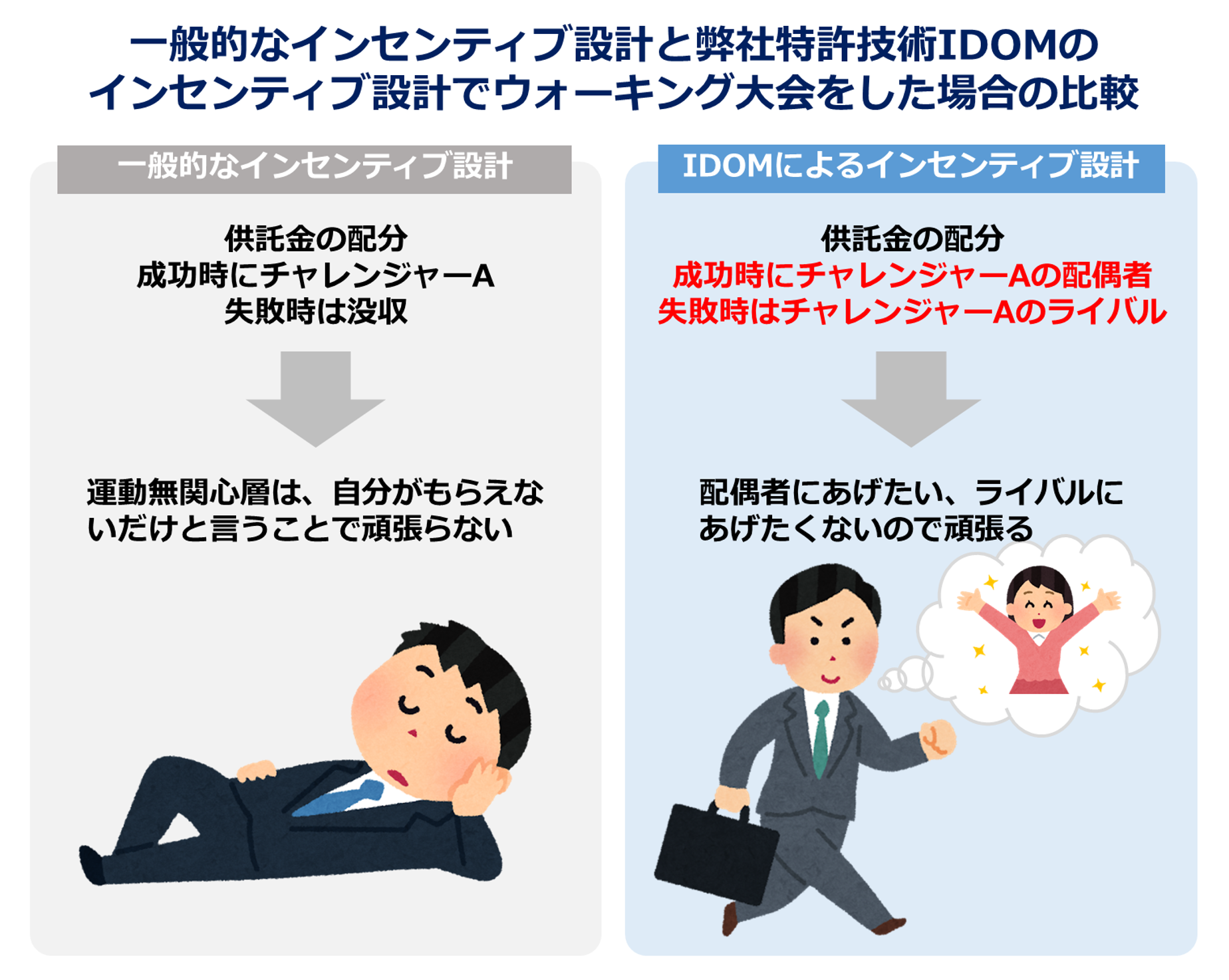 下図は、企業がウォーキング大会を一般的なインセンティブ設計で行った場合と、当社特許技術IDOM*1のインセンティブ設計で行った場合で比較したものです。