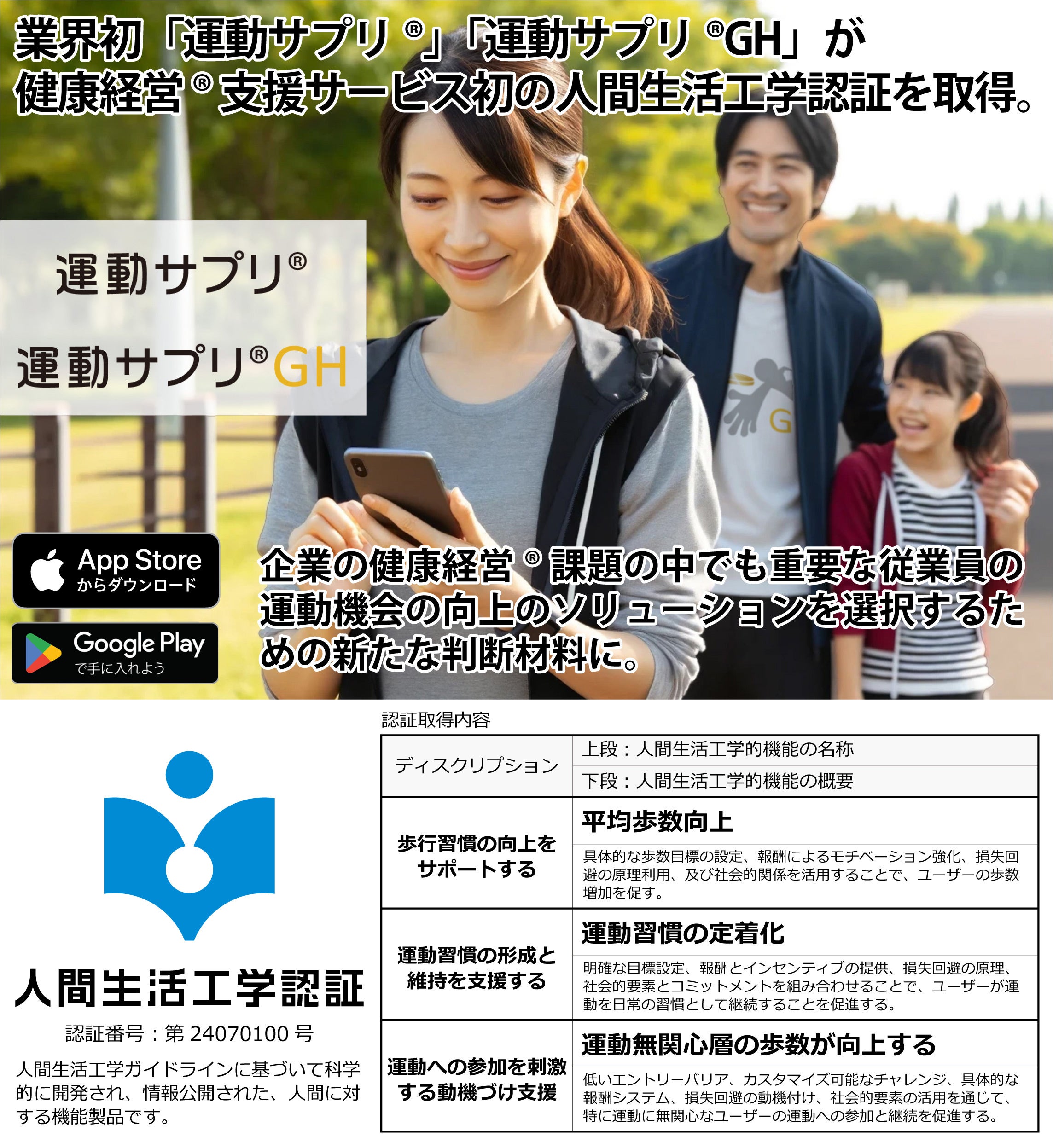 業界初「運動サプリ®」「運動サプリ®GH」が健康経営®支援サービス初の人間生活工学認証を取得。企業の健康経営®課題の中でも重要な従業員の運動機会の向上のソリューションを選択するための新たな判断材料に。