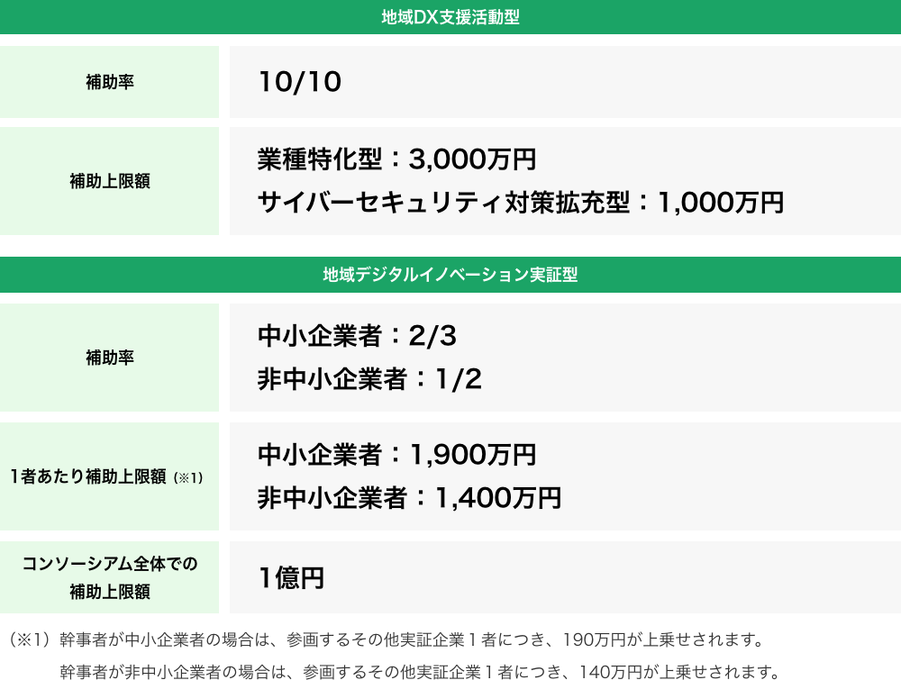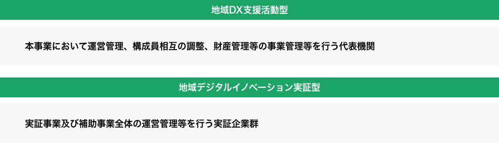 本補助金は、地域企業・産業がデジタル技術を活用した業務・ビジネスモデルの変革を実行するために、以下「地域DX支援活動型」と「地域デジタルイノベーション実証型」の2事業に要する費用を補助します。