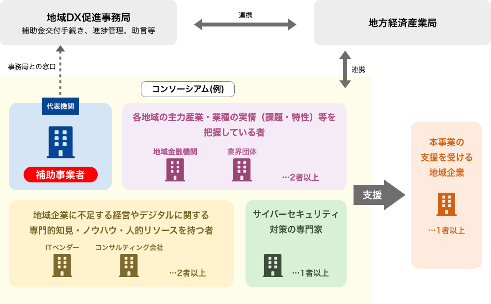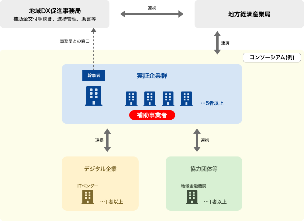 本事業は、地域の主力産業が抱える課題に精通した産学官金の専門家による地域企業への課題分析、DX戦略・計画策定、サイバーセキュリティ対策の伴走支援等の体制を構築するとともに、多数の地域企業等が連携した実証プロジェクトの創出を行う事業を通じて、地域企業・産業で取組が遅れているDXを強力に推進することを目的とします。