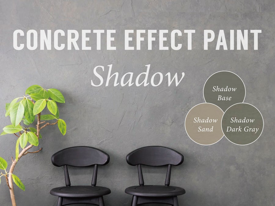 これまでナチュラルなインテリアに似合う明るめのカラー『セメント』セットのみの展開でしたが、多くのお客様から「モダンな雰囲気の部屋や店舗に合うモルタル調で暗めな色味のコンクリートエフェクトペイントが欲しい」とのご要望をいただき、既存カラーの『セメント』よりも暗く濃い色味の『シャドウ』セットの発売に至りました。より暗く濃い色味に仕上げた新色『シャドウ』は床や壁面をモダンでシックな印象に仕上げることができます。