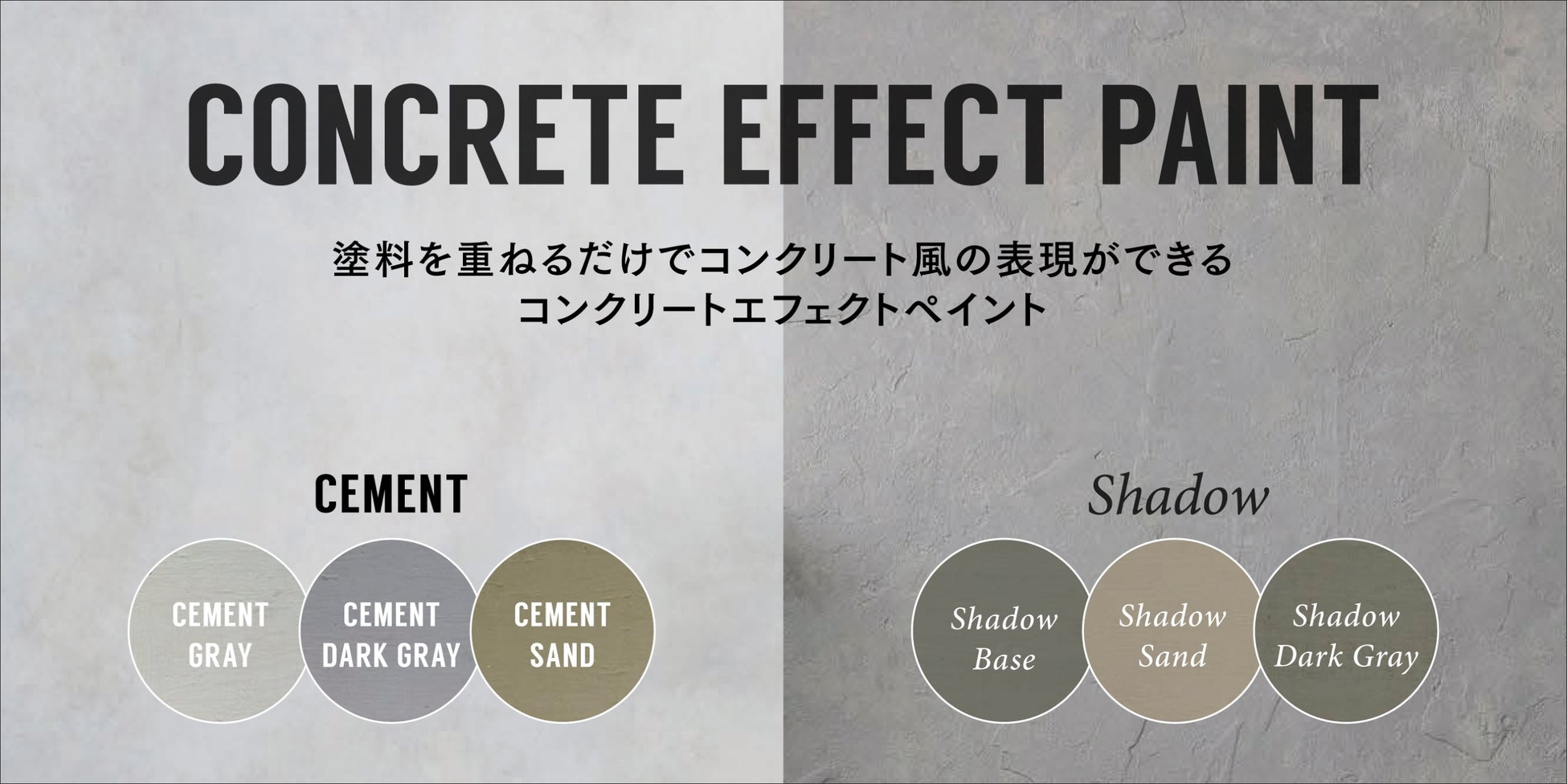 コンクリートエフェクトペイントは、3色の塗料を塗り重ねていくだけで重厚なコンクリートを表現できるDIY用塗料セットです。『セメント』は本物のコンクリート板と照らし合わせて、『シャドウ』はカラーコンクリートを参考に調色した3色をセットにしましたので、塗るだけでリアルなコンクリートを表現することができます。