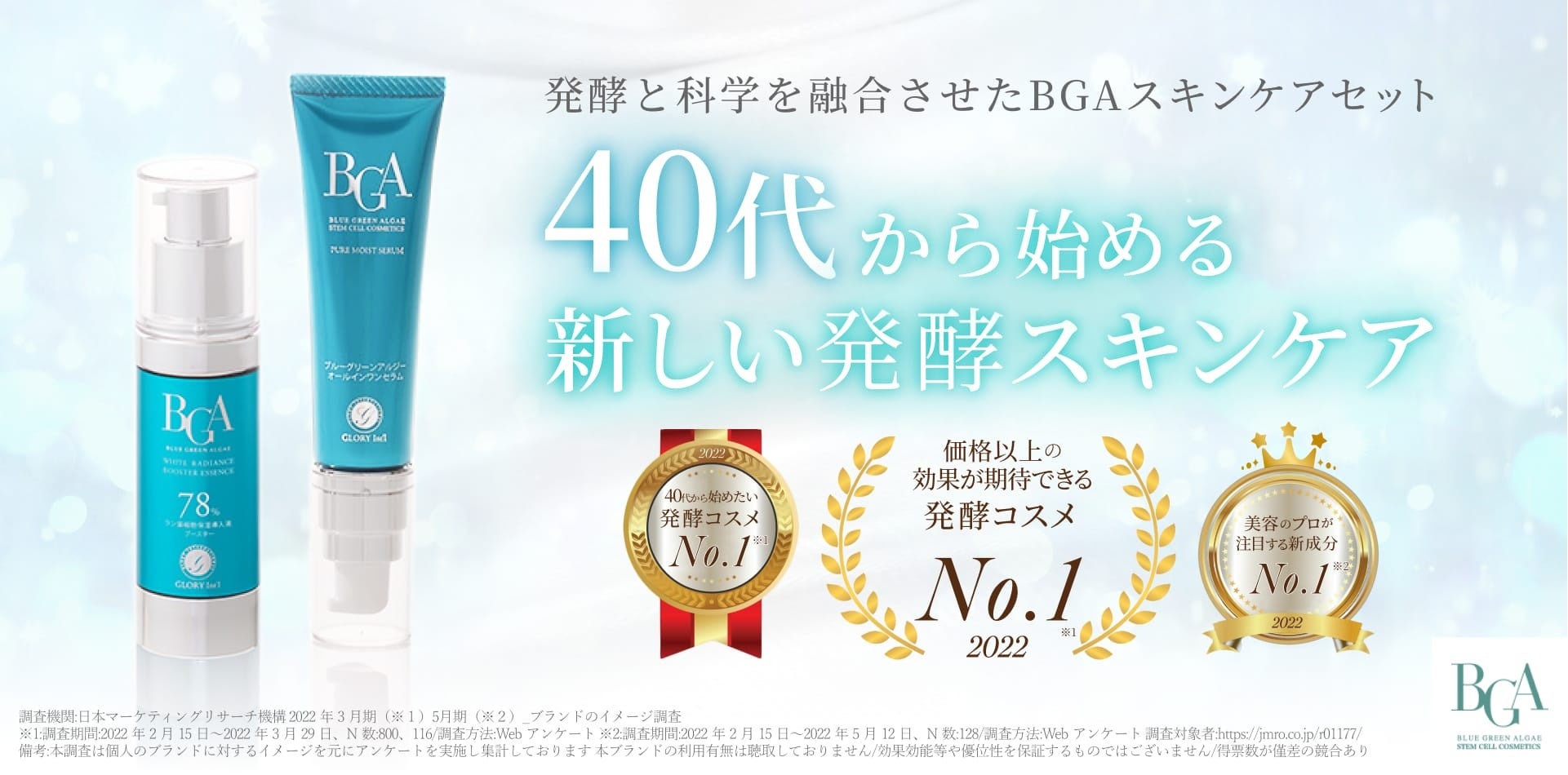 また、BGAスキンケアシリーズは日本マーケティングリサーチ機構が、2022年3~5月に発酵コスメについてインターネット調査を実施した結果、『価格以上の効果が期待できる発酵コスメNo.1』※2『40代から始めたい 発酵コスメ No.1』※2『美容のプロが注目する新成分 No.1』※3も獲得している、プロも認めるコスメシリーズです。