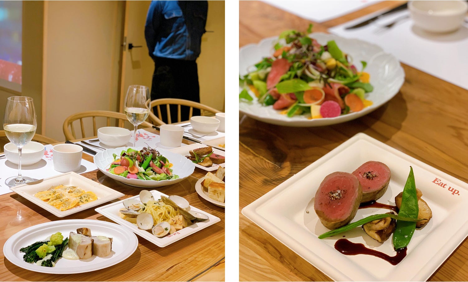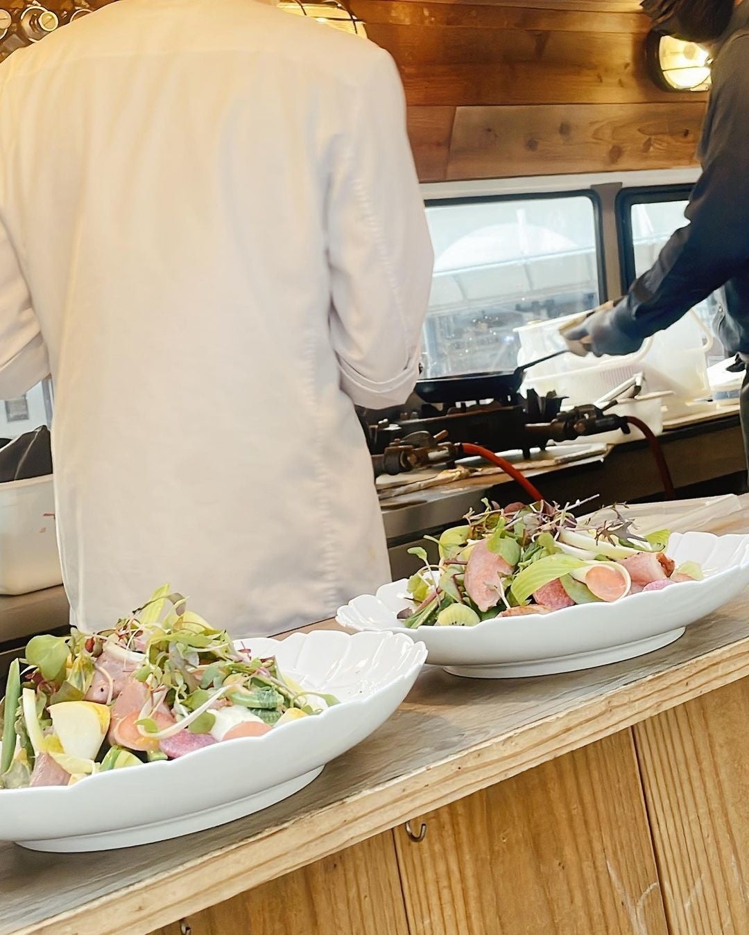 今昔荘には大人数のゲストのために、皿やお椀などが十分に備え付けられており、サービスご利用日には、YOKOZUKEのキッチンカーが今昔荘の近くに停車し、今昔荘に備え付けの食器を活用して、調理したての料理を提供します。