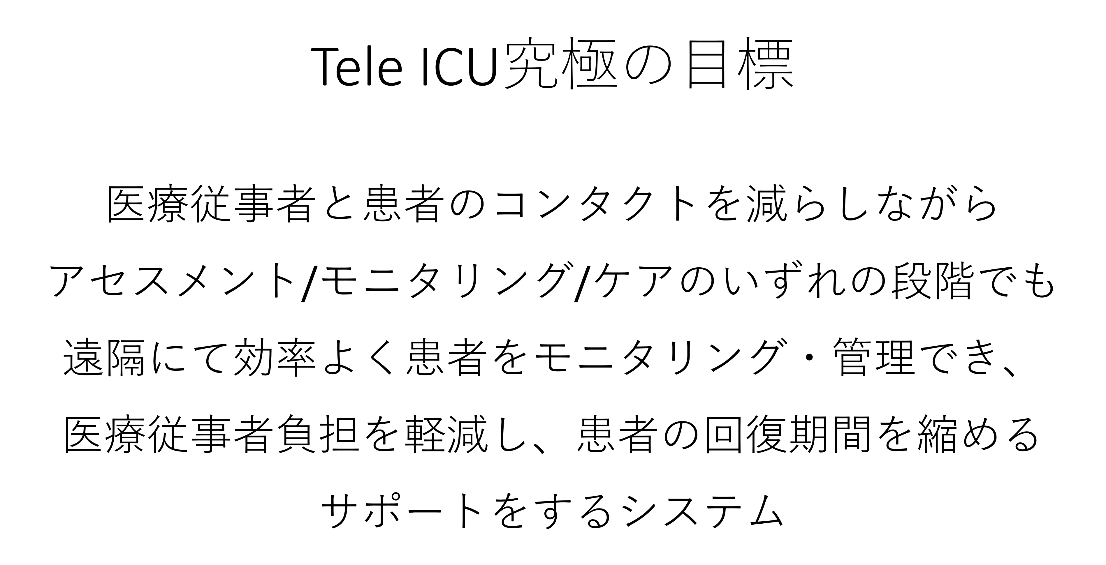 ICUで使用する機器は人工呼吸器ECMOをはじめ、バイタルサインやパルスオキシメーターなど複数設置されています。これは数値や波形を専門の医師が目視することで患者のちょっとした変化や予兆を読み取ることがICU患者の管理に重要なことだからです。パンデミック禍におけるICU管理では、専門医師、チーム人員不足や感染リスク低減のため、なるべくICUに入室する人数や機会を減らすことが重要です。また効率の良い患者管理は患者の回復期間を縮め、より速やかに通常業務を再開することに寄与します。新型コロナ以降、がんなど入院での治療に緊急性が少ないが放置することで深刻化する病気を抱える患者の治療が後回しにされることが問題視され※1、パンデミック禍の感染患者管理の効率化は今後も社会と病院を正常に機能させるために大変重要な課題となっています。