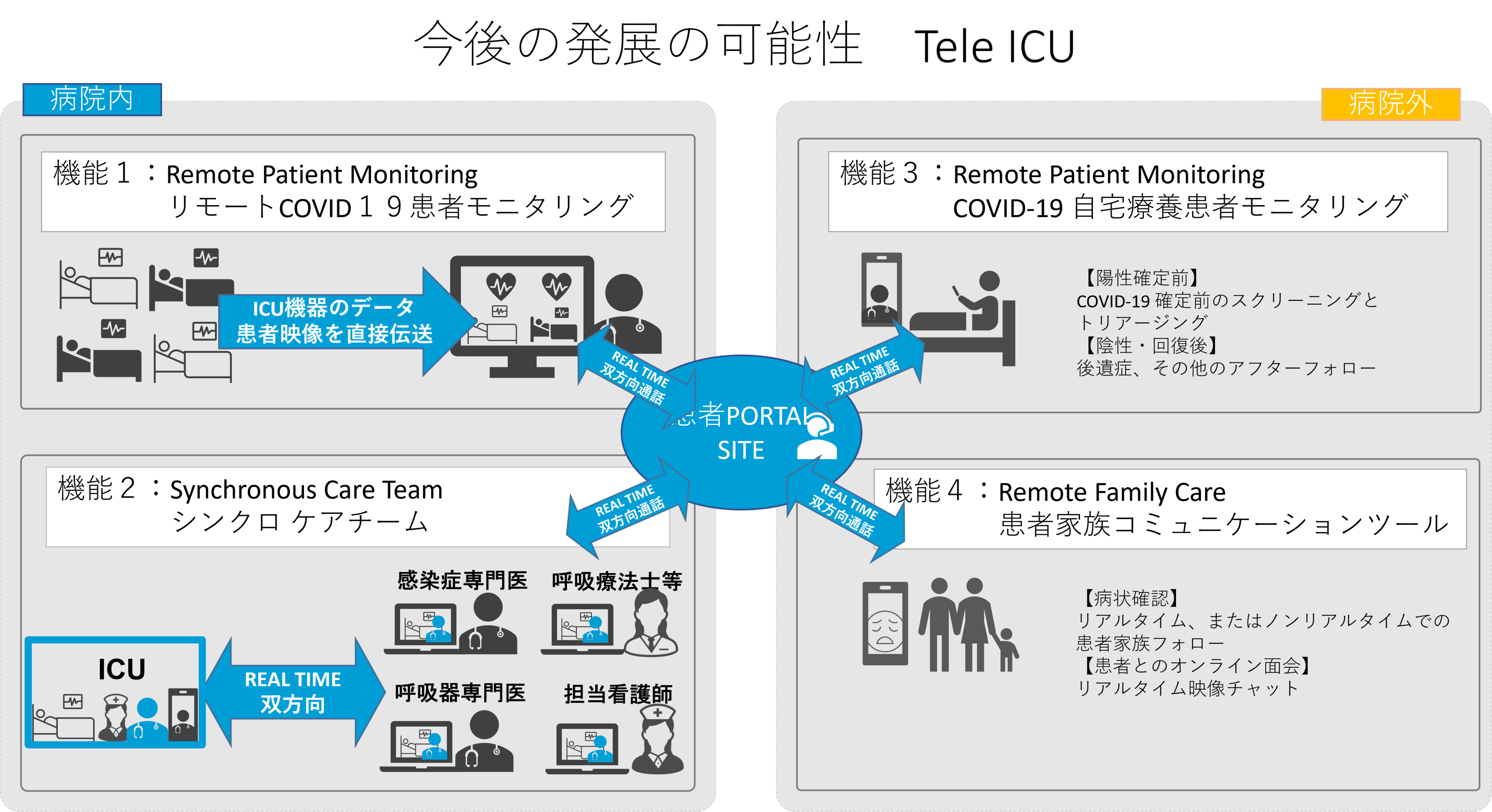 パンデミックのピークを迎えるとICU室は病床使用率が急激に高くなり通常業務が滞ります。通常よりもICUの数を増やし対応するための管理体制づくりと運用は人的リソースだけで即応する体制を作るのは大変困難で、院内では賄いきれない専門性の高いスタッフを常駐させることも難しくなってきます。