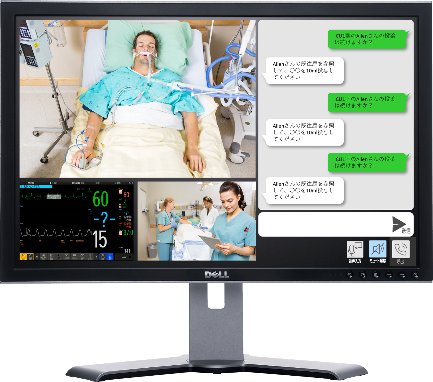 また、双方向のコミュニケーションはリアルタイム性が高く、遅延も少なくやり取りはスムーズで、フェイスカメラ以外の入力項目(バイタルやSpo2など波形を目視すべき項目)を拡大表示することもできます。まるでICU内部で確認しているかのように自由に閲覧することができます。