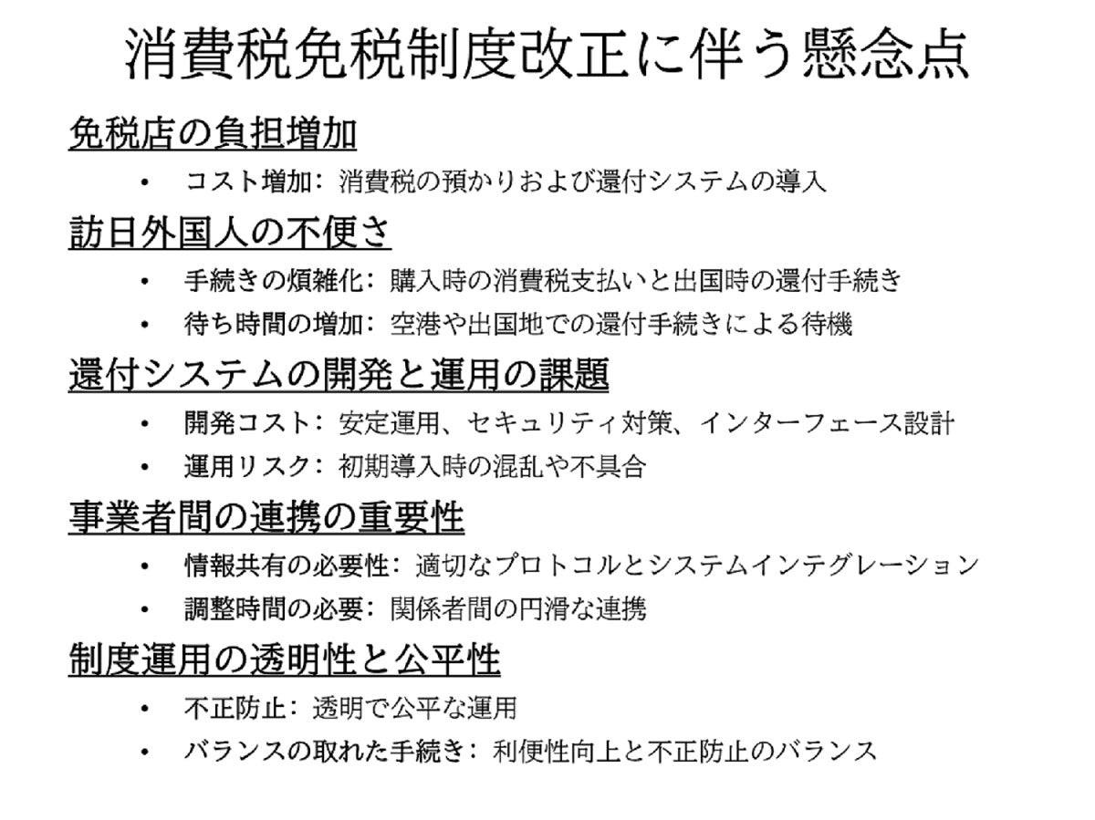 これらの懸念点を踏まえつつ、免税店の負担を極力減らし、訪日外国人に対する情報提供やサポート体制の充実を図ることで、免税制度の信頼性向上と利用促進を図ることが重要となります。